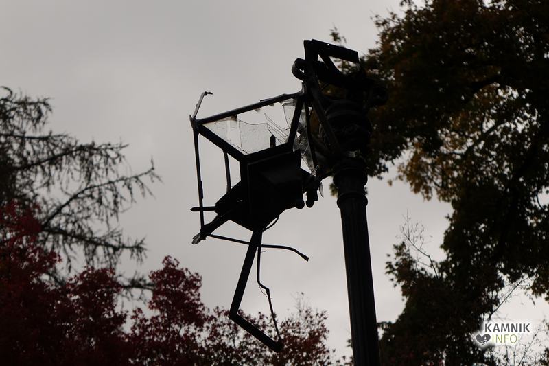 K sreči je težka veja med padcem zdruznila oz. polomila zgolj železno ograjo in svetilko javne razsvetljave.