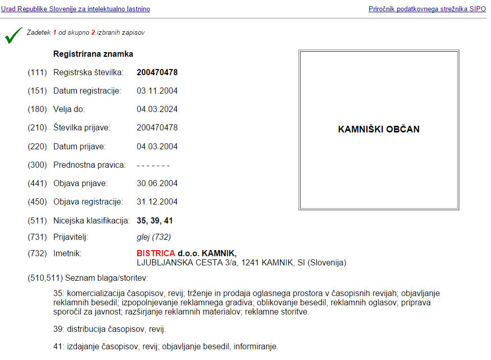 - Podatki o registraciji blagovne znamke Kamniški občan.