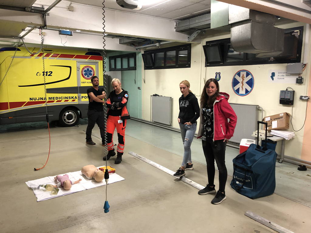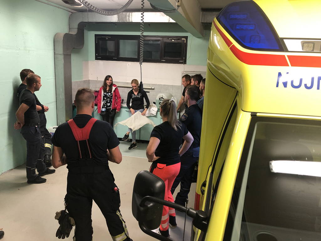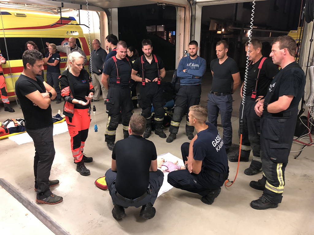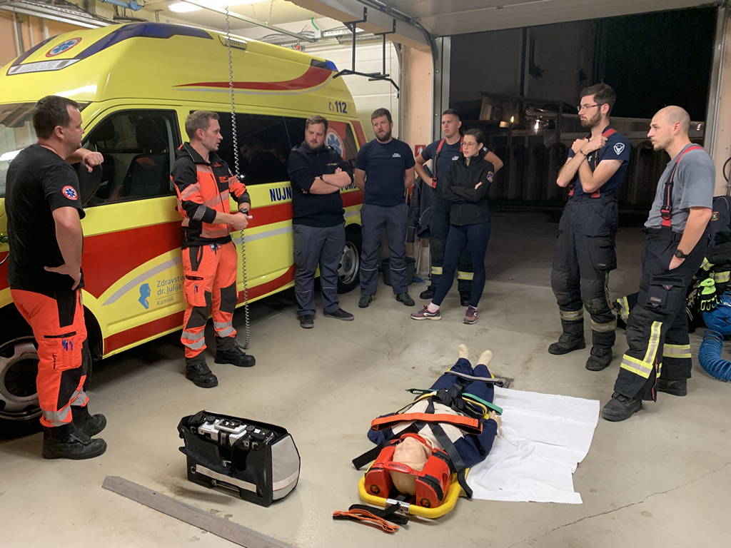Prvo strokovno izobraževanje je potekalo na Reševalni postaji zdravstvenega doma Kamnik. Uslužbenci NMP Kamnik so pripravili tri delovne točke; na dveh smo obravnavali življenjsko ogrožajoča stanja in njihovo razreševanje po zadnjih smernicah (huda krvavitev, zapora dihalne poti, srčni zastoj in zastoj dihanja, motnja zavesti), na tretji pa smo bili gasilci deležni usposabljanja s področja asistence pri manipulaciji s prenosno medicinsko opremo, ki je na razpolago v reševalnem vozilu, in njeno uporabo.