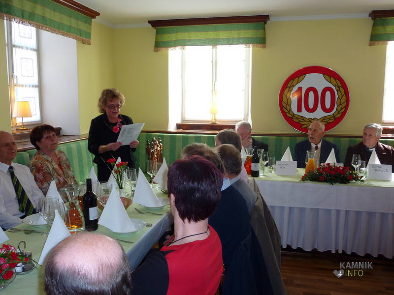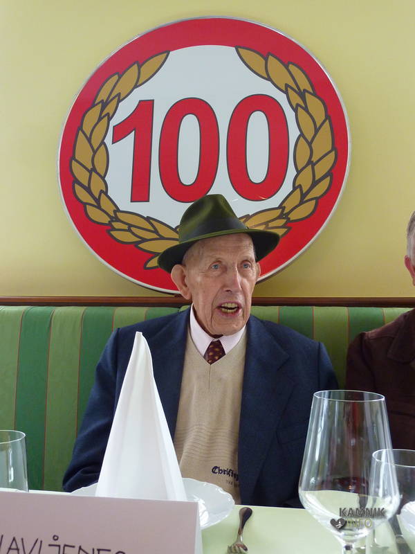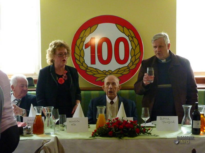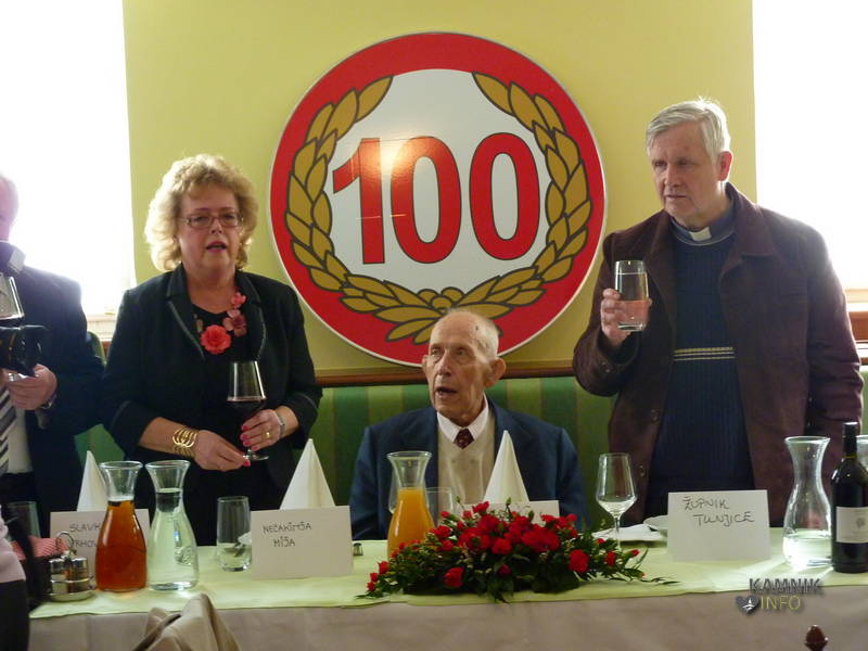 Po obvezni zdravici, je v rokah Denisa Kregarja zazvenela harmonika in v jedilnici kamniškega hotela je zazvenela pesem: »Kolkr kapljic, tolko let!«, ki ji je stoletni slavljenec pritegnil tudi sam.