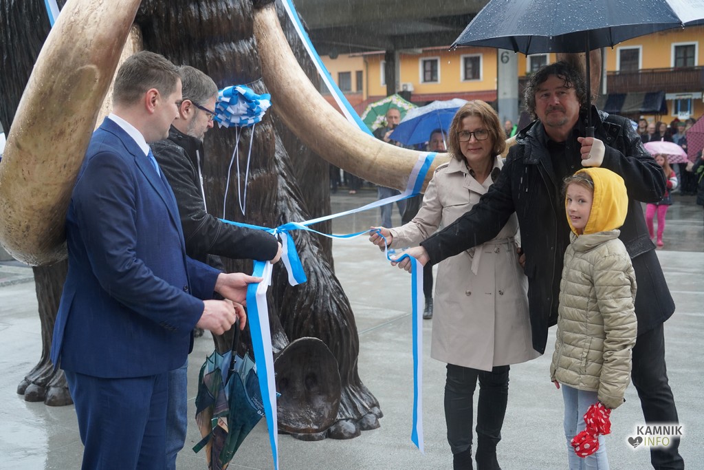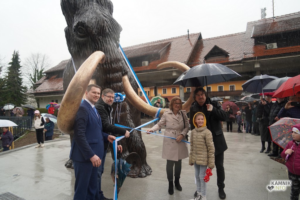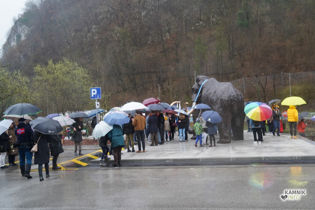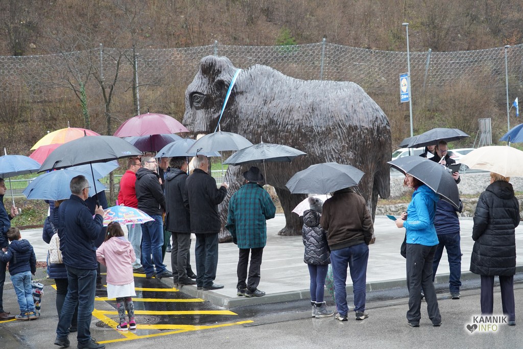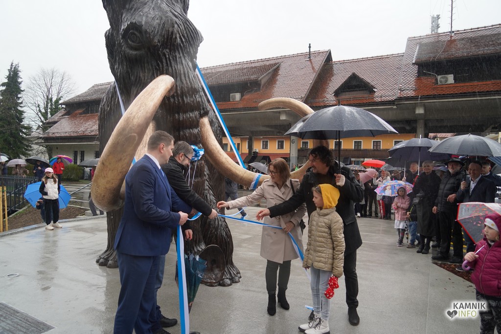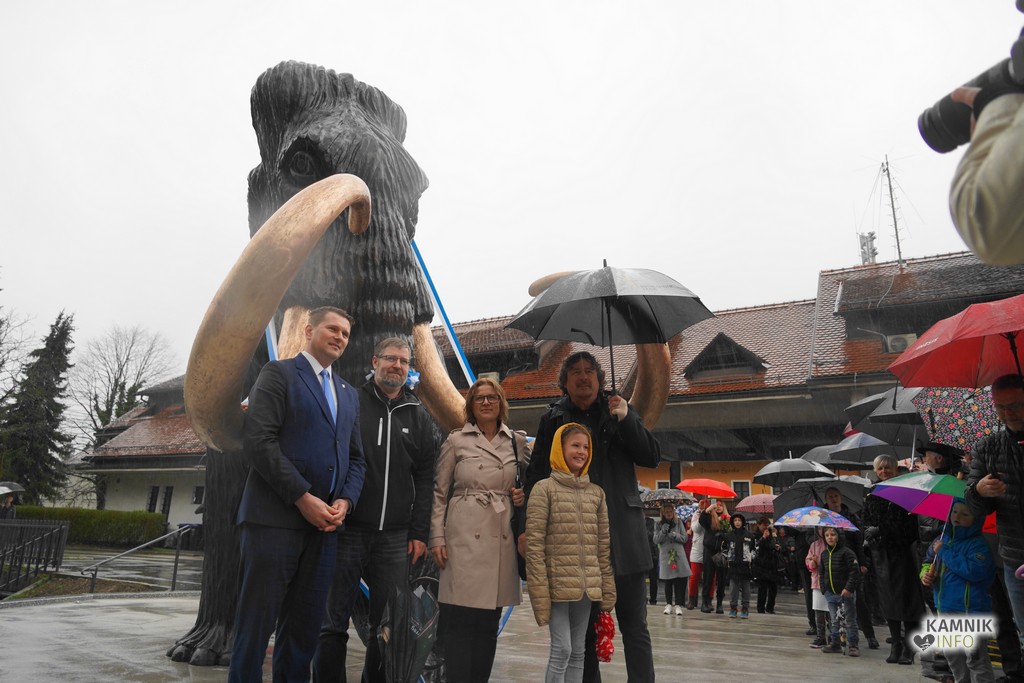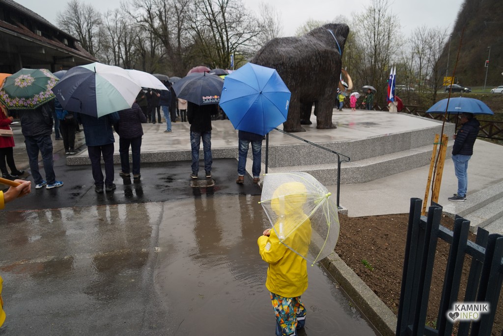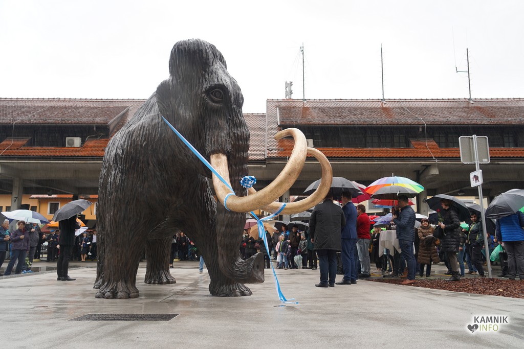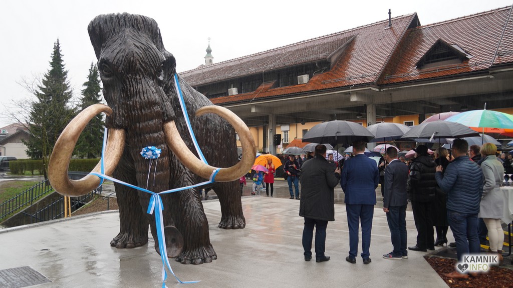 Navkljub kislemu in prav nič prijaznemu vremenu se je danes dopoldne pod streho kamniške avtobusne postaje zbrala kar precejšnja množica, ki se je udeležila slavnostnega odprtja skulpture mamuta v naravni velikosti, ki jo je izdelal pokojni kamniški kipar Miha Kač.
