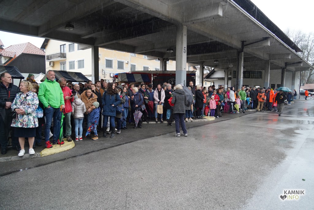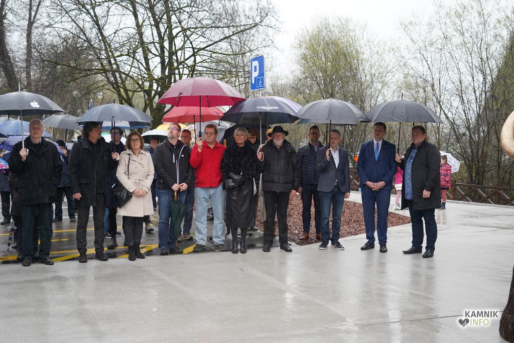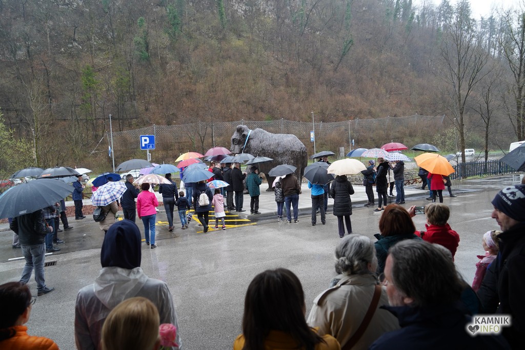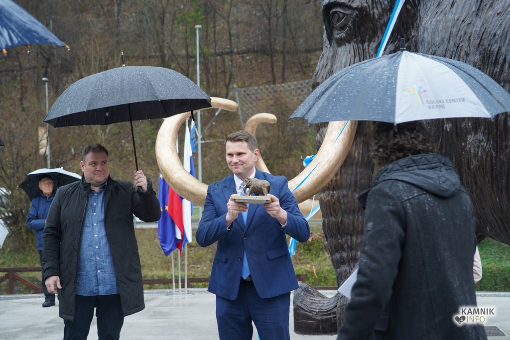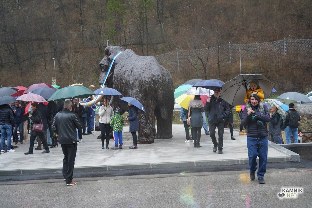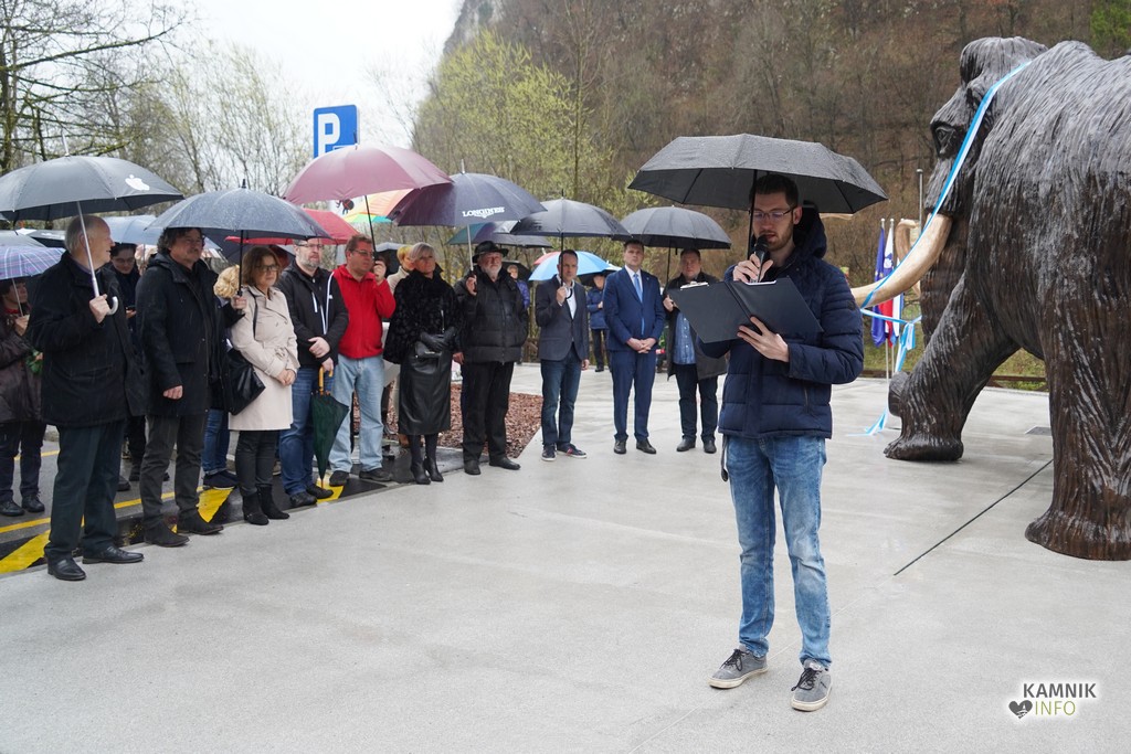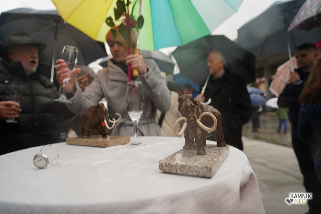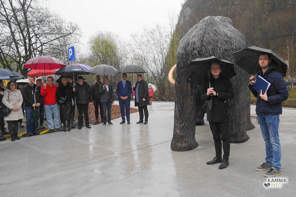 Navkljub kislemu in prav nič prijaznemu vremenu se je danes dopoldne pod streho kamniške avtobusne postaje zbrala kar precejšnja množica, ki se je udeležila slavnostnega odprtja skulpture mamuta v naravni velikosti, ki jo je izdelal pokojni kamniški kipar Miha Kač.