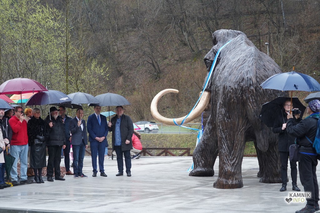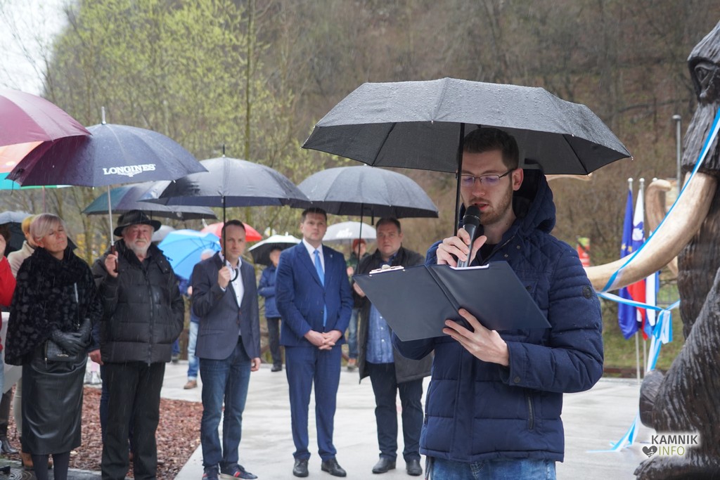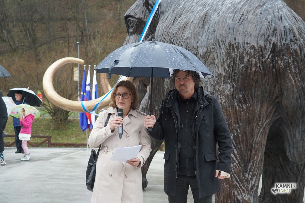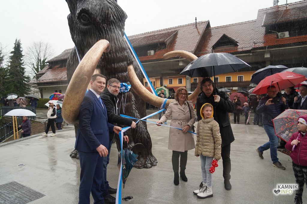 Ob škrebljanju dežja, milozvočnih vižah Mestne godbe Kamnik in mamutskem ropotu skupine The Stroj so zbrane nagovorili Matija Križnar, paleontolog Prirodoslovnega muzeja Slovenije, v katerem hranijo okostje v Nevljah najdenega mamuta, Karla Kač Kališnik, hči pokojnega avtorja skulpture Mihe Kača, ki pa postavitve njegovega mamuta, tako kot tudi ne njegova, nemalo zaslužna in pred natanko dvema letoma preminula žena Meta, žal ni dočakal, ter kamniški župan Matej Slapar.
