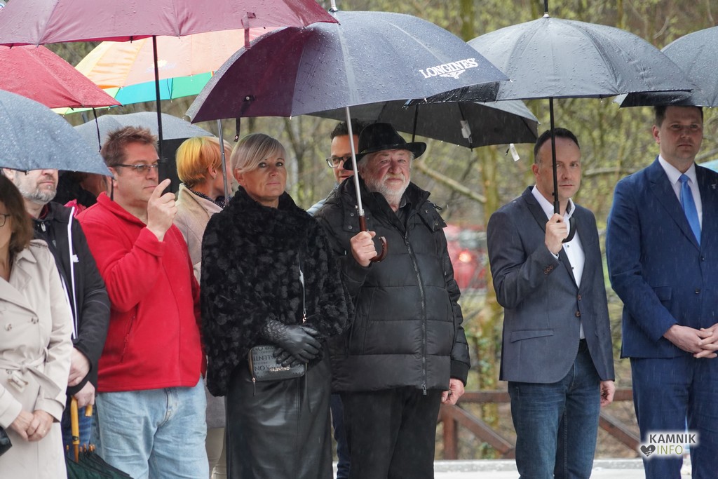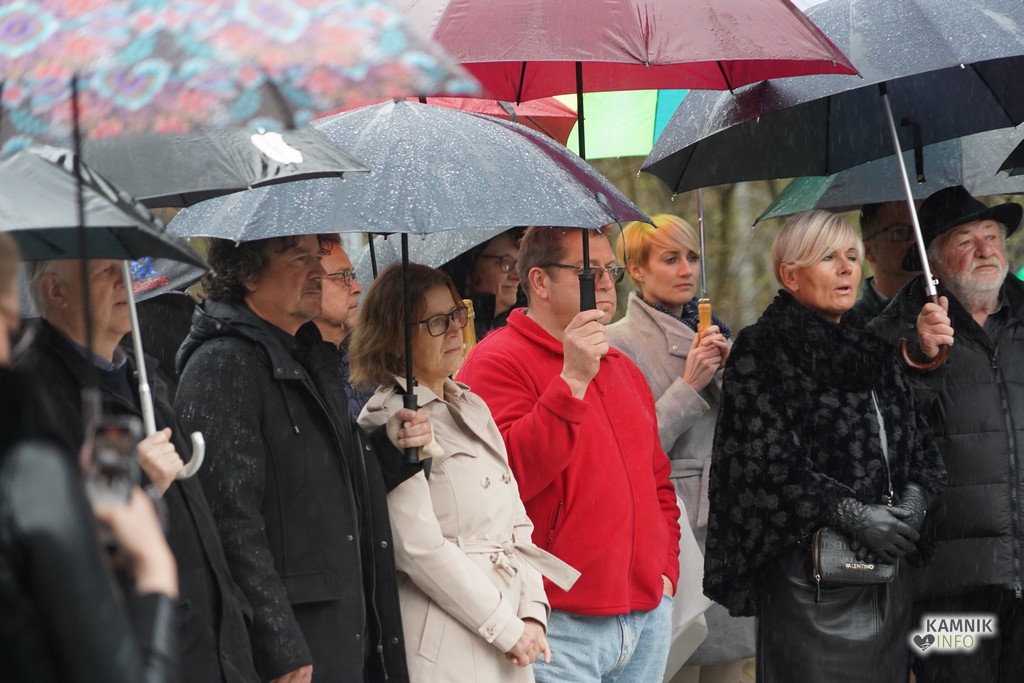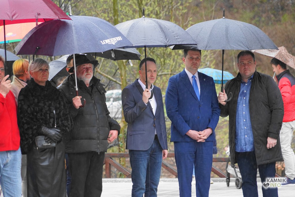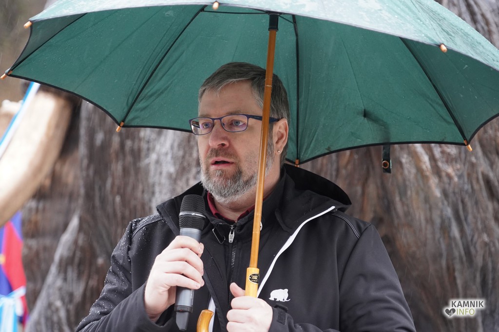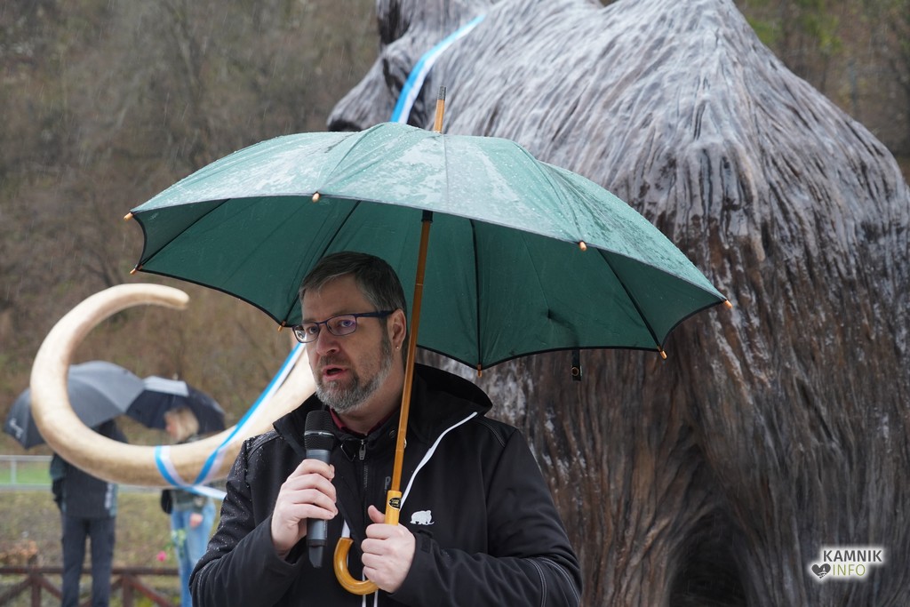 Ob škrebljanju dežja, milozvočnih vižah Mestne godbe Kamnik in mamutskem ropotu skupine The Stroj so zbrane nagovorili Matija Križnar, paleontolog Prirodoslovnega muzeja Slovenije, v katerem hranijo okostje v Nevljah najdenega mamuta, Karla Kač Kališnik, hči pokojnega avtorja skulpture Mihe Kača, ki pa postavitve njegovega mamuta, tako kot tudi ne njegova, nemalo zaslužna in pred natanko dvema letoma preminula žena Meta, žal ni dočakal, ter kamniški župan Matej Slapar.