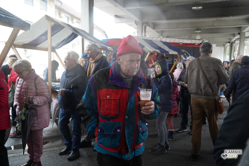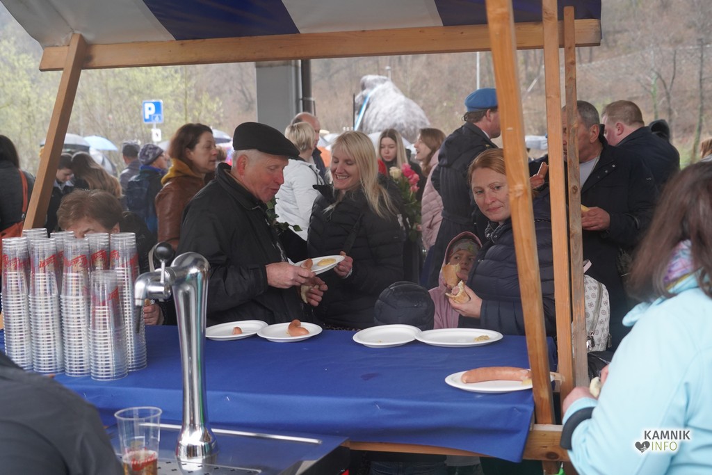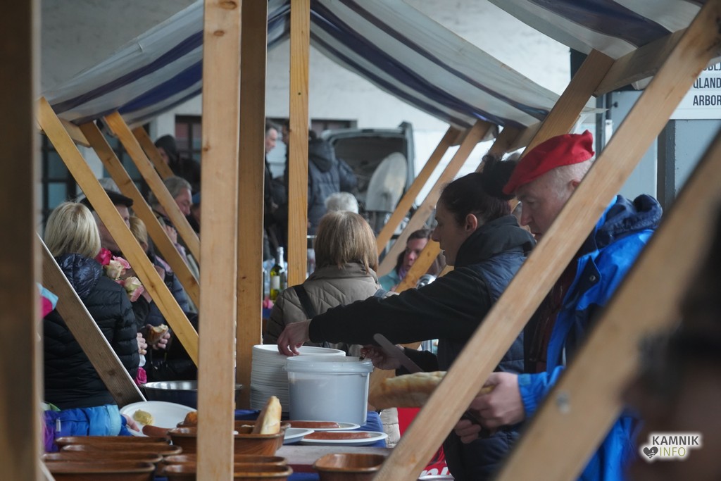 Ker pa mamutov, razen tega bronastega, ki od nedavnega krasi glavno kamniško avtobusno postajo, ni več, da bi lahko katerega izmed njih, z vsemi častmi in nad primerno velikim kupom žerjavice, kot nekdaj vola na Glavnem trgu, zavrteli na kakih deset tisoč obratih, so občinski velmožje poskrbeli, da so se zbrani, ki so v vlažnem hladu današnjega dopoldneva vztrajali do konca prireditve, lahko pokrepčali vsaj z zastonjskimi klobasami in pivom, medtem ko so si bolj zaslužni privoščili nekoliko bolj izbrano žlahtno kapljico.