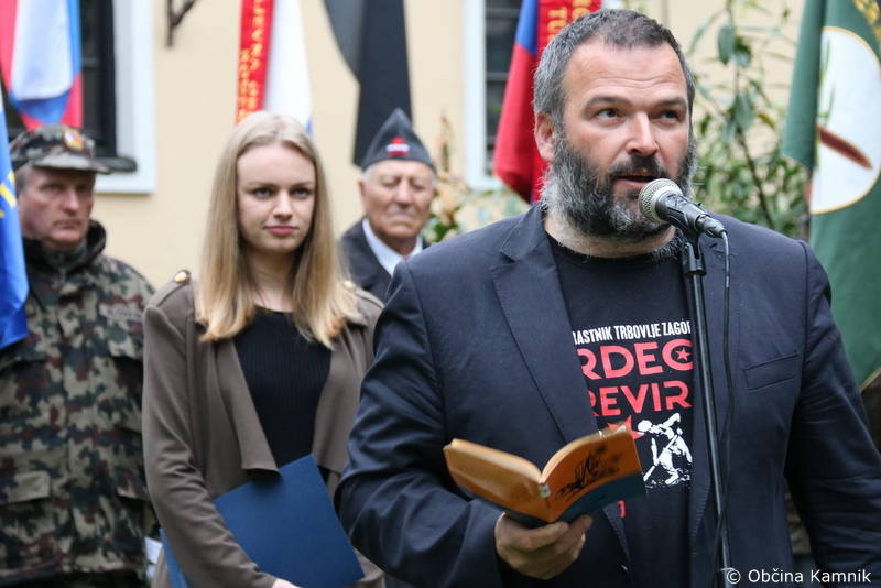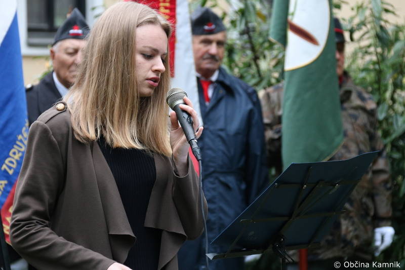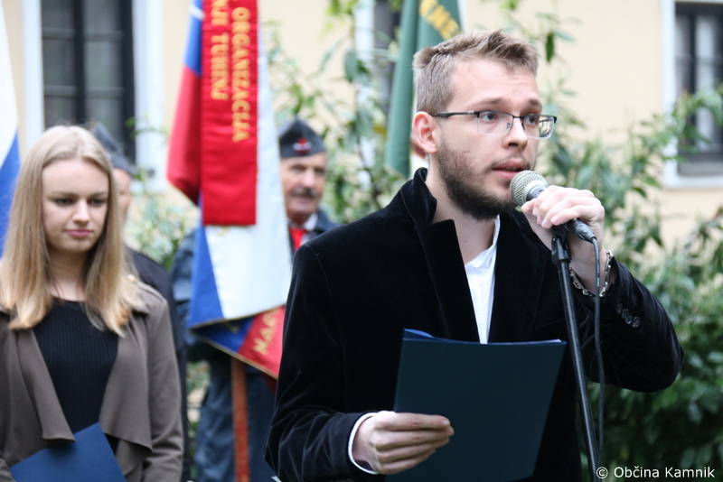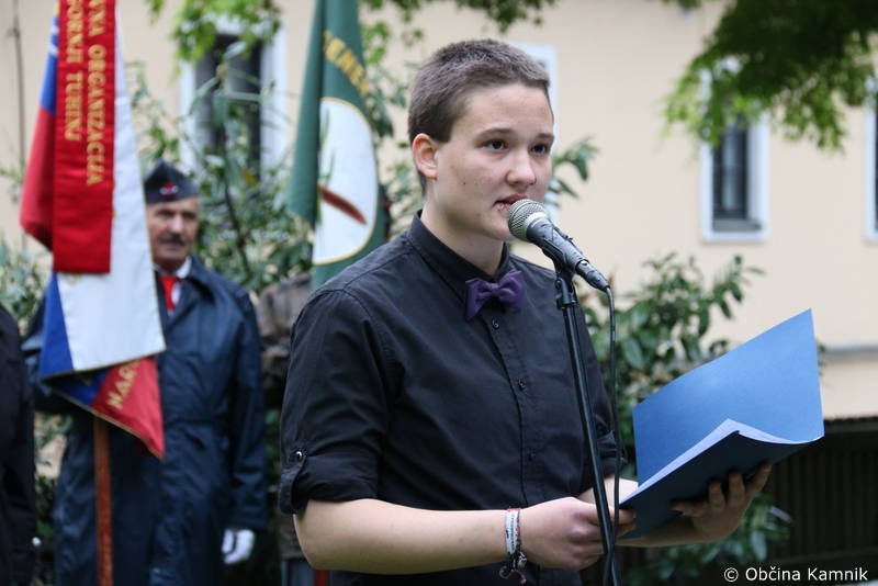 »Spoštovane in spoštovani, živeti moramo v tem trenutku in danes živimo v drugačnem času – v času, ko ne bomo spodbujali k uporu. Spodbudil pa bi vse k spoštovanju tistega, kar imamo in želel spomniti, da so v preteklosti posamezniki v tlakovanje našega današnjega dne položili tudi tisto najvrednejše – svoja življenja. Zato cenimo sedanji trenutek, spoštujmo današnji dan in spoštujmo to kar premoremo, veliko pa bi k večji povezanosti, spoštljivosti in enotnosti slovenskega naroda pripomogla tudi malo bolj povezovalna slovenska javna beseda. V preteklosti smo kot narod zmagovali lačni, goli in bosi, brez ustreznega orožja, v popolni negotovosti, danes pa siti in v objemu udobja tarnamo nad tem, kaj vse bi drugi morali storiti za nas. Ne sprašujmo se, zakaj se naše želje morda jutri ne bodo izpolnile, ko pa prenekatere posameznike njihove vrednote tudi na trenutek, kot je ta, vodijo vse kam drugam kot pa pokloniti se tukaj z nami – naši zgodovini, državi in narodu. Zaključil bi z razmišljanjem, da se nam morda na trenutke zdi, da se neuspeh pojavlja pogosteje kot uspeh, da je občutek pomanjkanja bolj razširjen kot bogastvo, ter da je razočaranje bolj običajno kot uresničitev pričakovanega. Neuspeh je neizogiben del uspeha in morebitni trenutni neuspeh ni nujno tudi dokončen. Glejmo nanj kot na začetek neke nove poti, če poti ni, si jo poizkusimo ustvariti, svoj uspeh pa presojajmo po tem, v kolikšni meri nam je dano uživati mir, zdravje in ljubezen. Vesel sem, da sem bil danes lahko del tega lepega dogodka, da sem vas lahko nagovoril kot državljan Republike Slovenije, Kamničan in hkrati predstavnik enote Slovenske vojske, ki domicilno pokriva tudi občino Kamnik. To priložnost bom izrabil tudi za izraz svojega osebnega občutka ponosa. Razlog zanj sem našel v svoji pripadnosti občini Kamnik, ki si z gospodom županom na čelu neprestano prizadeva za uravnotežen razvojni in kulturni napredek, ki je usmerjenem v dobrobit vseh prebivalcev in nikdar niti za trenutek ne pozabi pomembnosti pokloniti se zgodovinskemu spominu in naši domovini – Republiki Sloveniji. Želim vam lepo praznovanje jutrišnjega praznika in od vas pa se poslavljam z željo, da bi živeli s tistim, kar nas združuje, da bi svoje vrednote delili s kar največ ljudmi, ki jih danes ni tukaj in ponosno hodili po kamniških ulicah, ker smo lahko ponosni z razlogom. Srečno Kamnik in srečno Slovenija!«