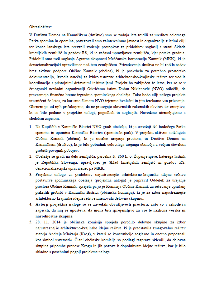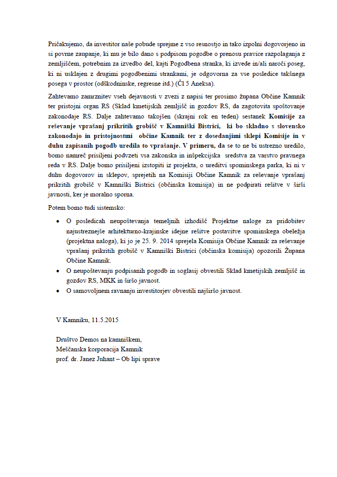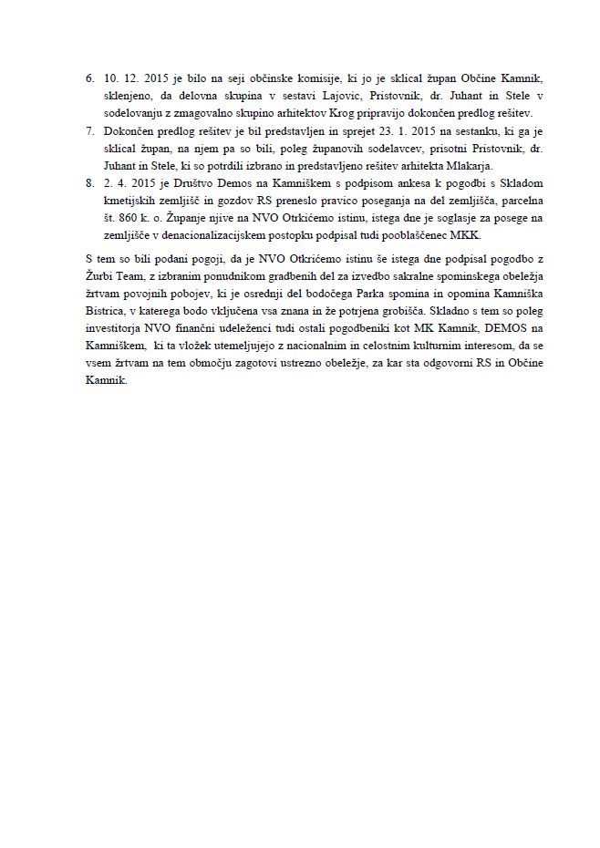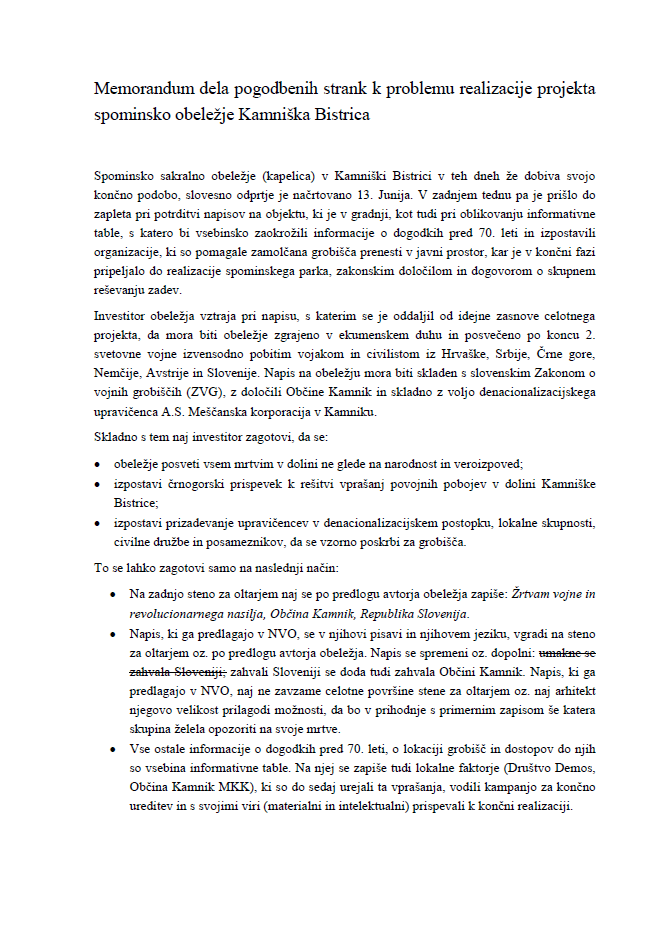V potrditev svojih resnih namer so sestavili celo Memorandum dela pogodbenih strank k problemu realizacije projekta spominsko obeležje Kamniška Bistrica, ki smo ga pridobili iz zaupnih virov in ga, kot zanimivost in za boljše razumevanje zapletov ter seznanjanja javnosti, prilagamo kot priponko v obliki pdf dokumenta – Demos Memorandum-1