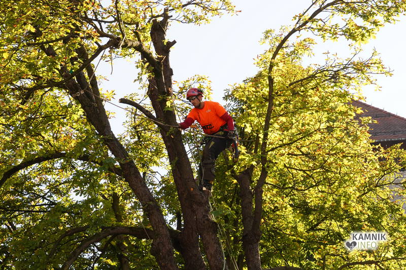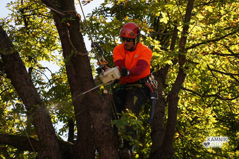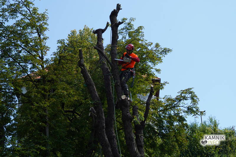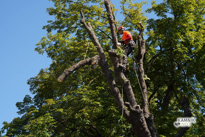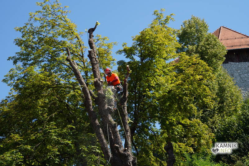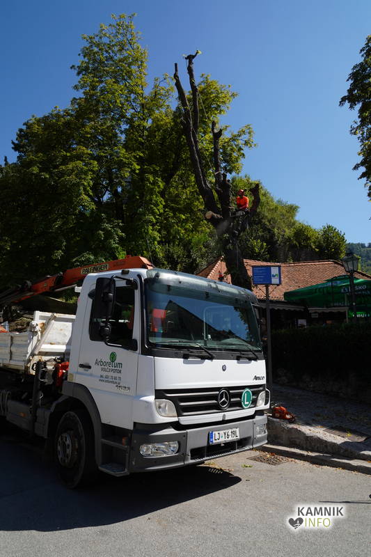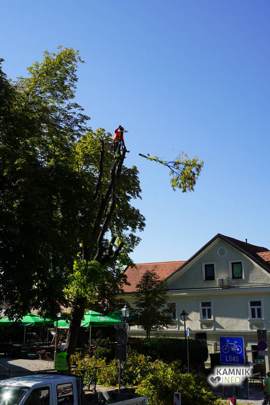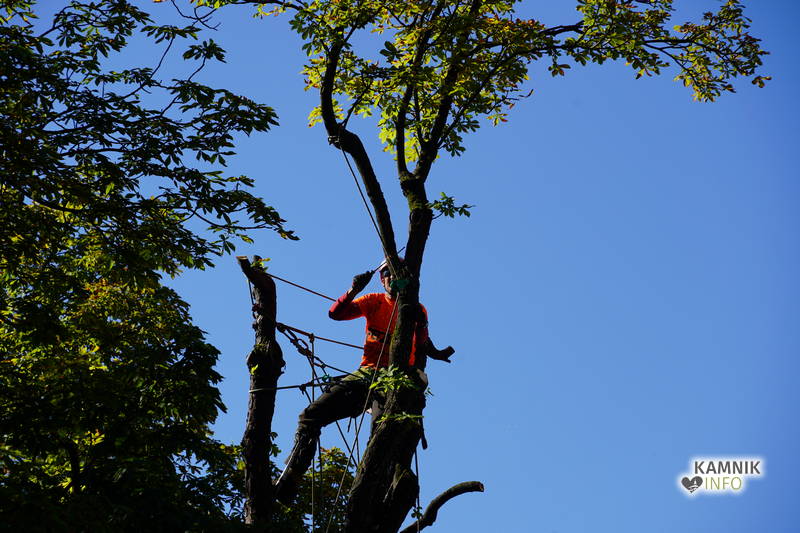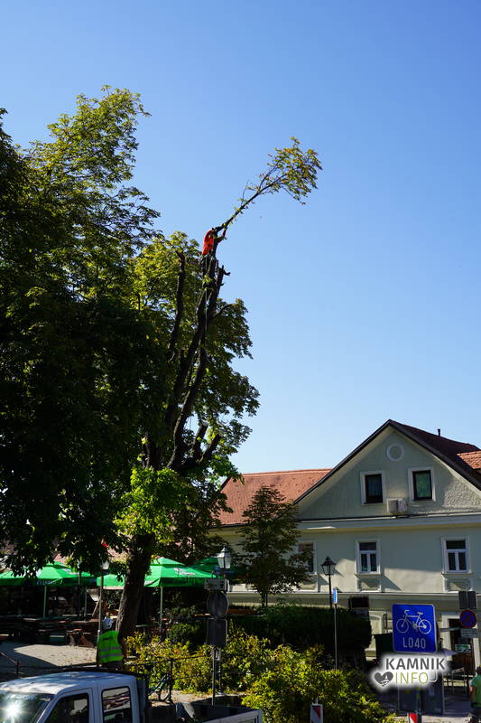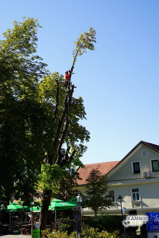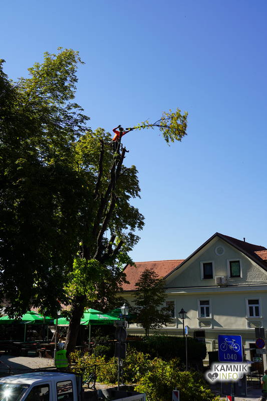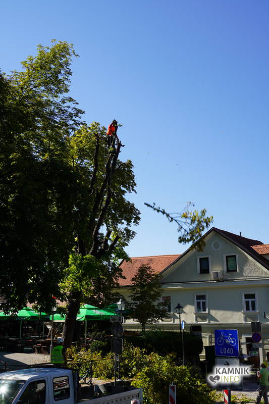 Včerajšnje dopoldansko dogajanje v središču Kamnika je v veliki meri zaznamovalo zahtevno in atraktivno odstranjevanje starega divjega kostanja na vrtu okrepčevalnice Pod gradom, ki se je že dlje časa in vse bolj nevarno nagibal nad ulico.