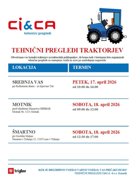Vse lastnike traktorjev in traktorskih priklopnikov obveščamo, da bomo tudi v letošnjem letu organizirali terenske tehnične preglede za omenjena vozila, in sicer po naslednjem razporedu: