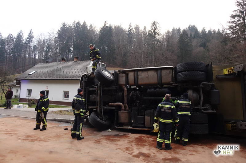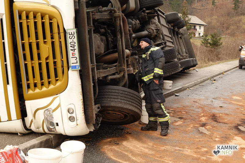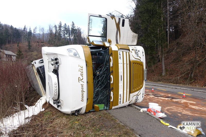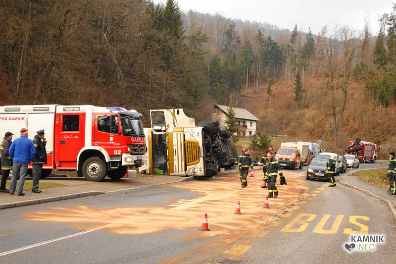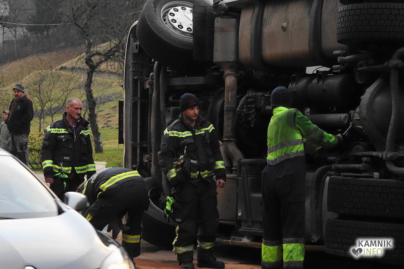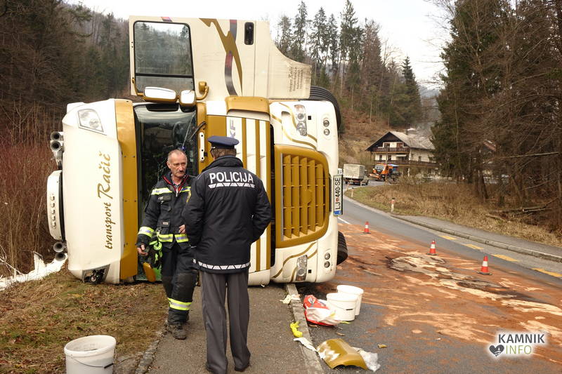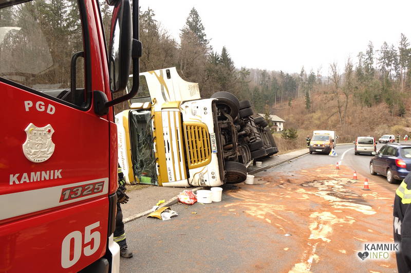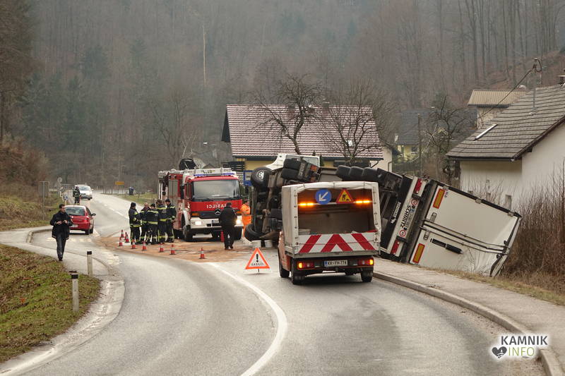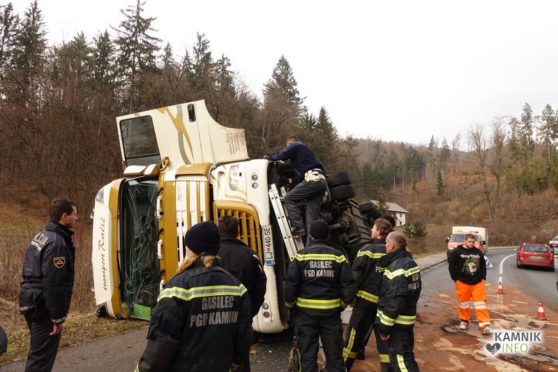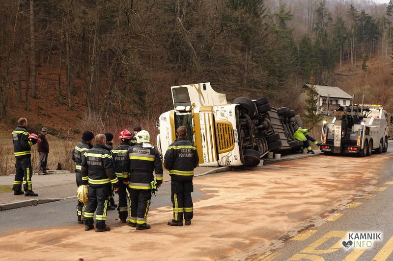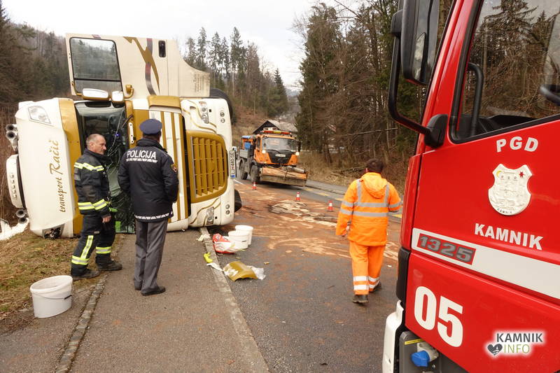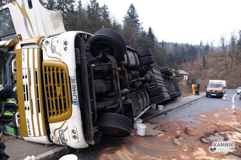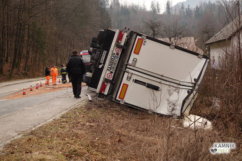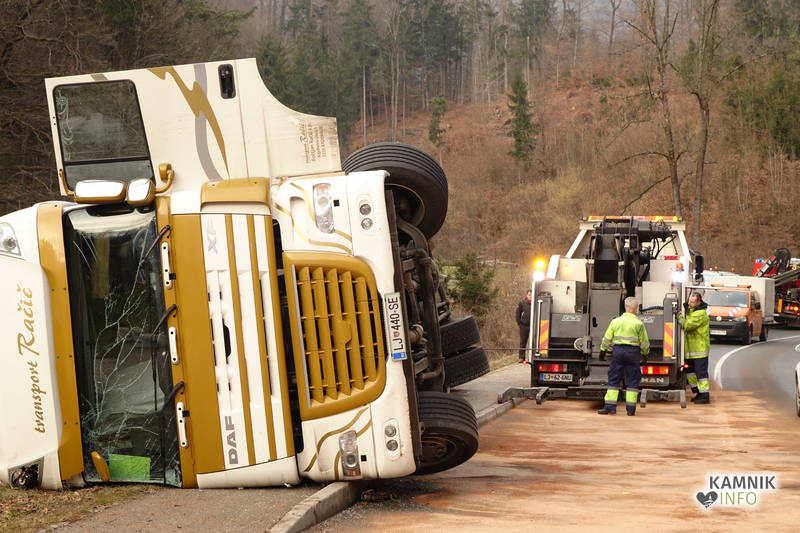 Na regionalni cesti Kamnik-Ločica je v kraju Poreber oz. na Kavranskem klancu, znova prišlo do prometne nesreče, v kateri se je prevrnil polno naložen tovornjak s priklopnikom.