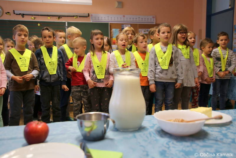 Župan Matej Slapar je sprva obiskal Osnovno šolo Šmartno v Tuhinju, kjer je zajtrkoval z ravnateljico mag. Darjo Krašovec, otroci prvega razreda pa so jima s ponosom zapeli prijetne pesmice in ju lepo postregli z maslom, medom, toplim mlekom in domačimi jabolki. Seveda so marsikaj vedeli povedati tudi o pomembnosti tega, da jemo domačo hrano, z županom so se pogovarjali ravno o tem. Da je zdrav zajtrk pomemben za dober začetek dneva, so ponosno povedali otroci šole.