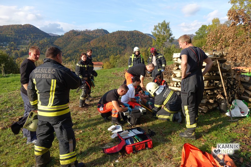 Nekaj pred pol peto popoldan je pri pripravi drv na Selih pri Kamniku prišlo do delovne nesreče, v kateri je manjši traktor, na katerega je bil pripet cepilni stožec, poškodoval občana.