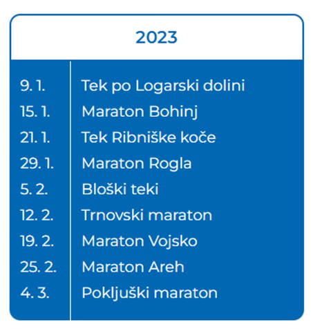 Triatlonci so pridno zbirali točke na maratonih tekom cele zime in sicer Maraton Rogla, Bloških tekih, Trnovskem maratonu, Maratonu Vojsko in Pokljuškem maratonu.