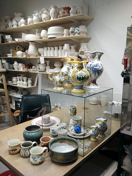 - med izdelki značilne kamniške keramike in klasične poslikave, od majolk, skodelic, ploščic, kozarcev,