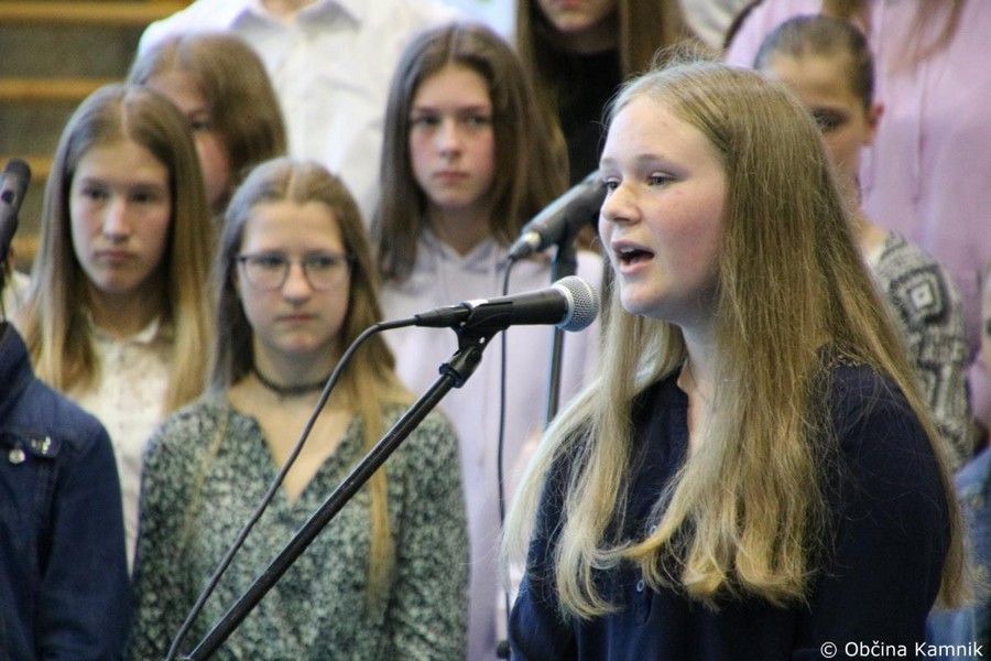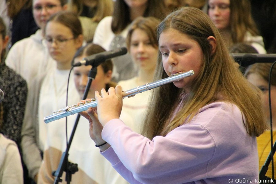 Zapel nam je Otroški pevski zbor, Ajda Pirc je nastopila s trobento, nežno ljubezensko pesem Ferija Lainščka in Gorazda Čepina Ne bodi kot drugi sta zapeli in zaigrali Tjaša Cevec in Lana Erzar, na violončelu pa se nam je predstavila Tina Bizjak. Prisluhnili smo Mladinskemu pevskemu zboru, Zoja Smolnikar Husić se je predstavila s prečno flavto, Kristjan Semprimožnik Grzinčič je zaigral na klavirsko harmoniko, Neža Ropret in Lana Erzar pa sta navdušili s pesmijo Vsak po svoje. Marko Heriček je na klavinovi spremljal zbora, ki ju je vodil Peter Pogačar. Za preplet misli in besed sta poskrbeli Loti Baloh in Zala Štirn.