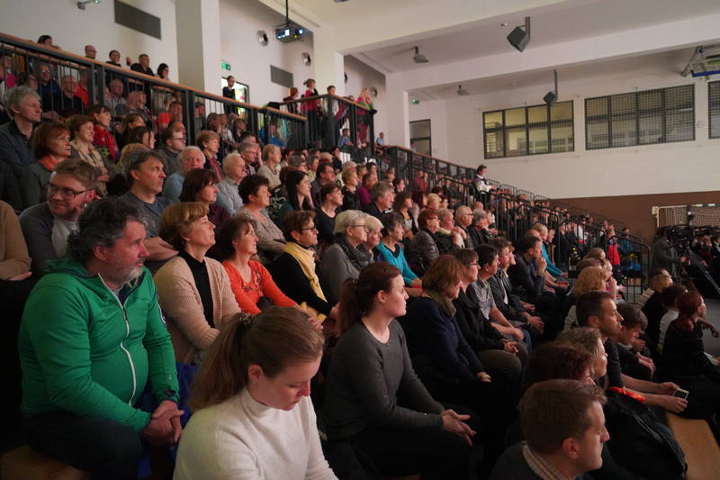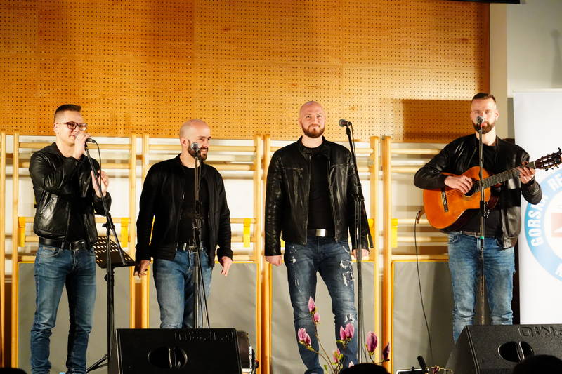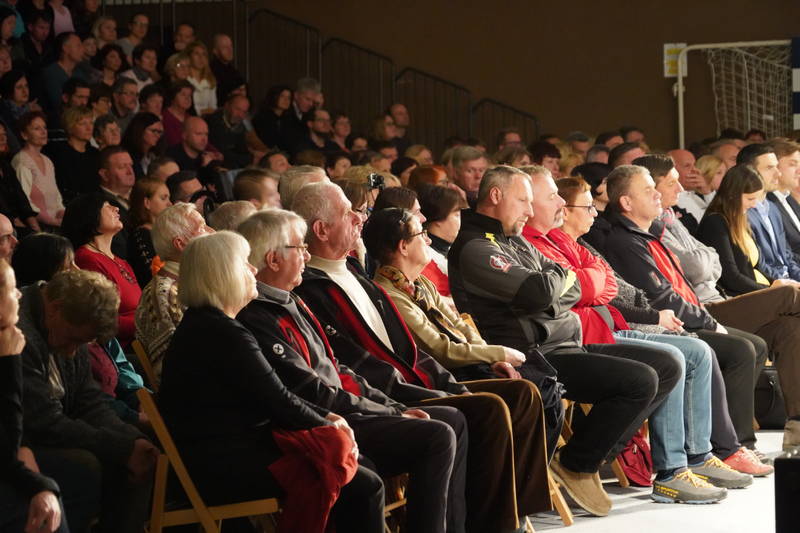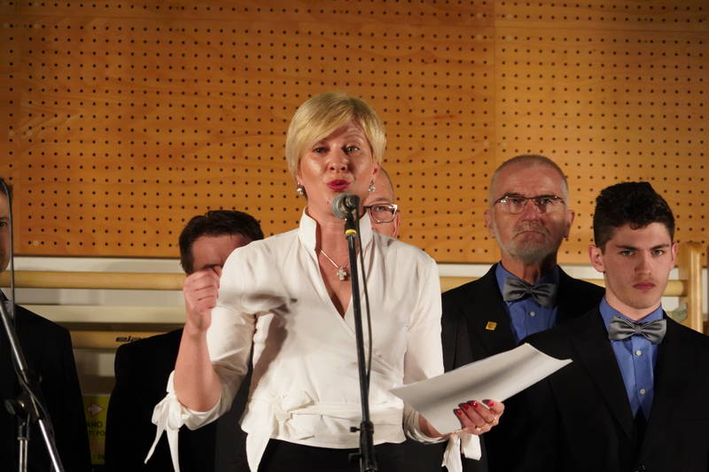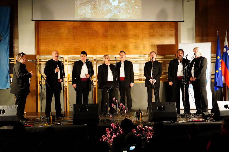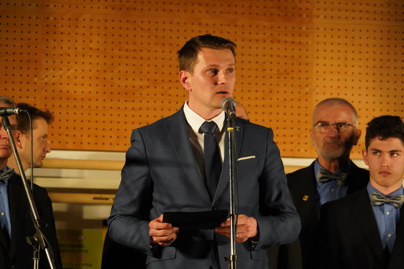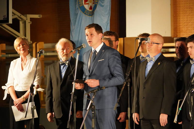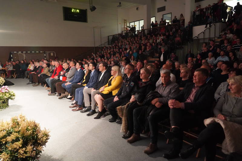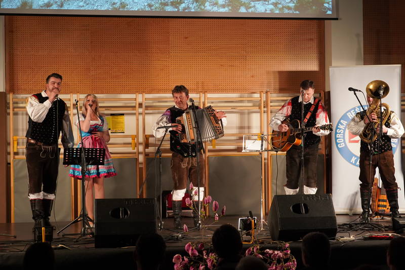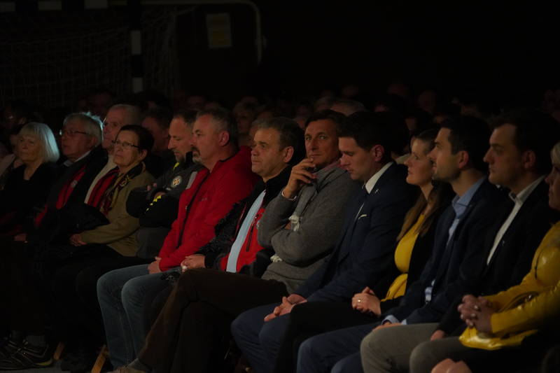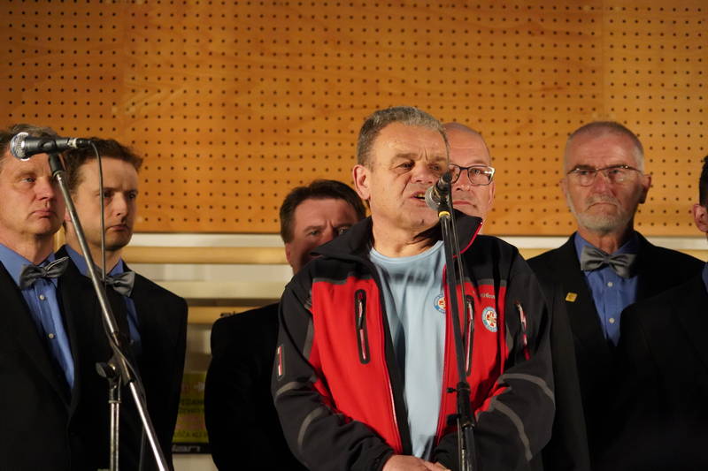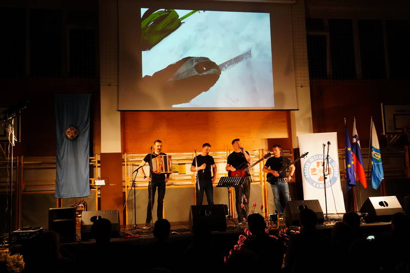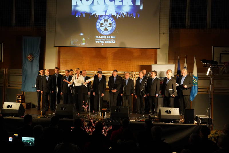 Številno zbrano občinstvo, ki je dodobra napolnilo šolsko telovadnico, saj je bil koncert razprodan že nekaj dni pred tem, sta na začetku prireditve nagovorila predsednik društva GRS Kamnik Srečo Podbevšek in župan Matej Slapar.