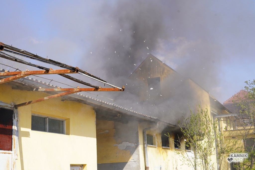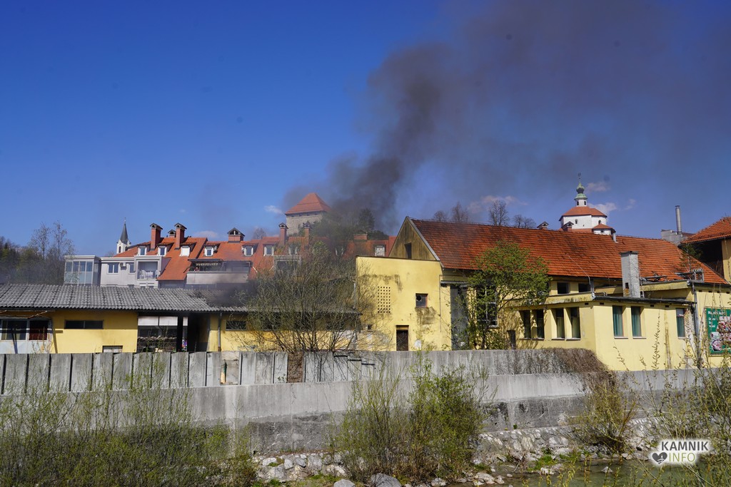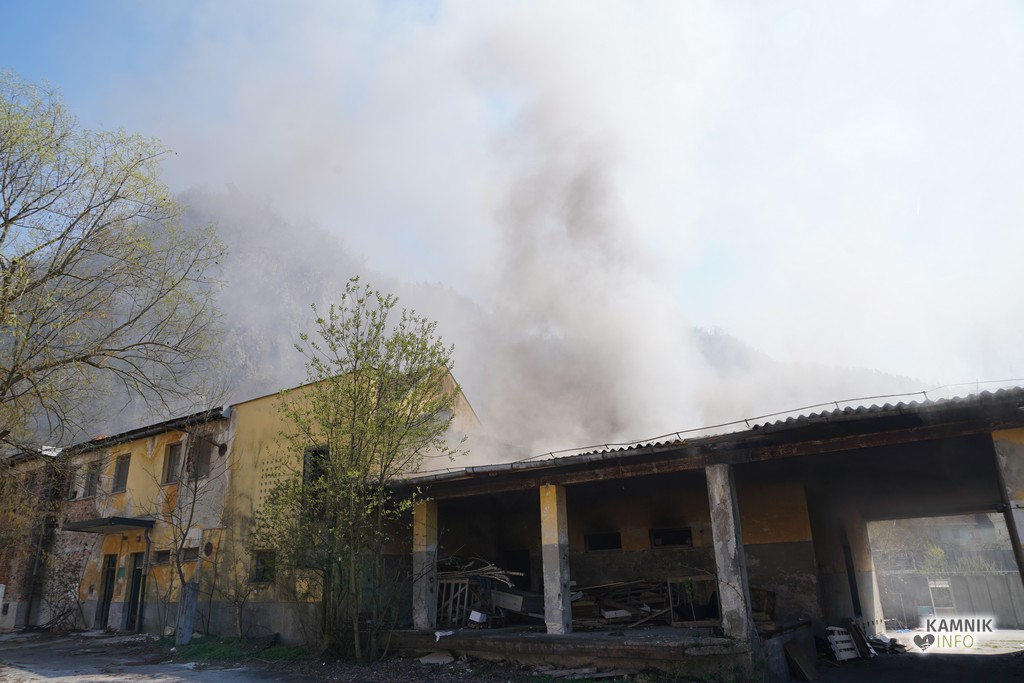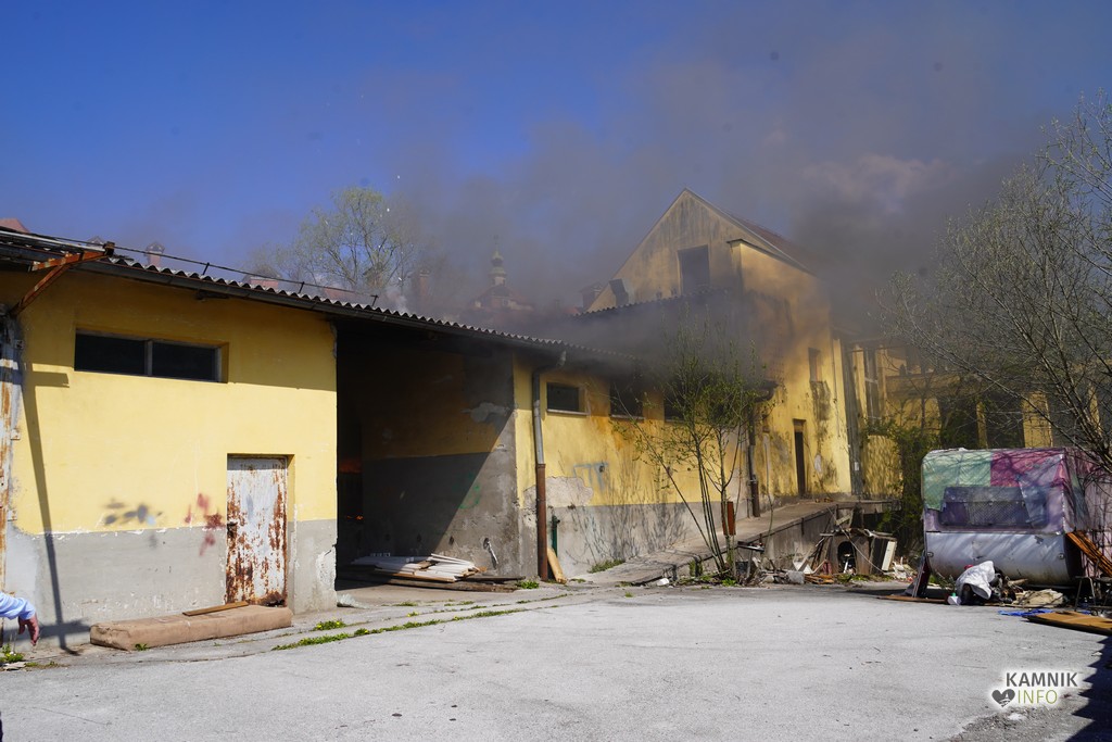 Del razpadajoče nekdanje kamniške klavnice, ki je v lasti Občine Kamnik, že dlje časa pa tudi pribežališče odvisnikov in brezdomcev, so okoli poldneva znova zajeli plameni.