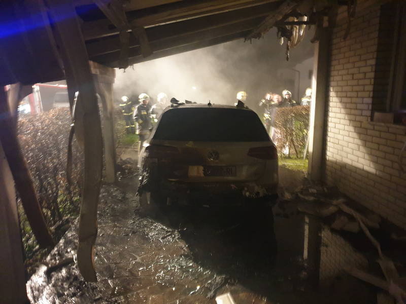 Kljub hitremu posredovanju gasilcev je bilo osebno vozilo znamke Volkswagen v požaru povsem uničeno, ogenj pa je uničil tudi plastično oblogo nadstreška.