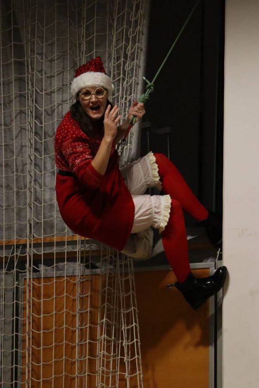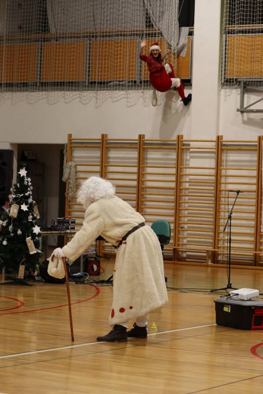 Naenkrat se je izpod stropa telovadnice po vrvi spustila gospa Božiček in vse presenetila s svojim na pol vojaškim manevrom. Še en VAUUU se je razlegel med občinstvom, ki so prej mirno spremljali vsakoletno šolsko proslavo ob državnem prazniku.