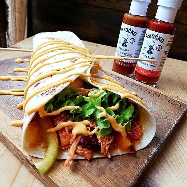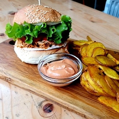 Specialna Darjina ponudba – burger ali jufka s »pulled pork«, omakico in hrustljavim pečenim domačim krompirčkom ter pikantni dodatki, razvitimi za Vratarnico, čili omakci Žajspoh in Barutanc (Pekočko)