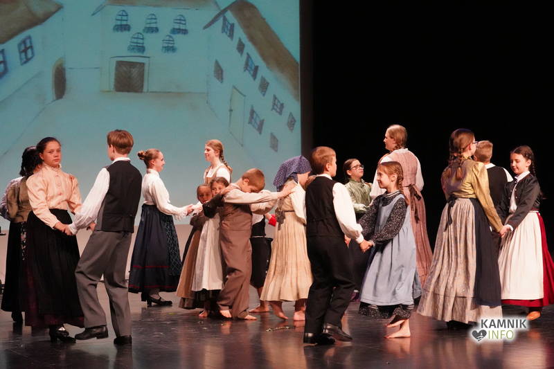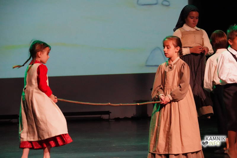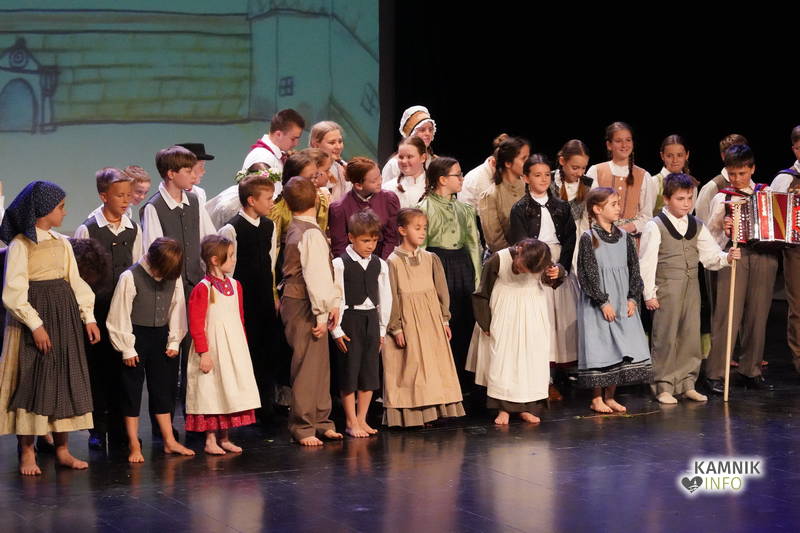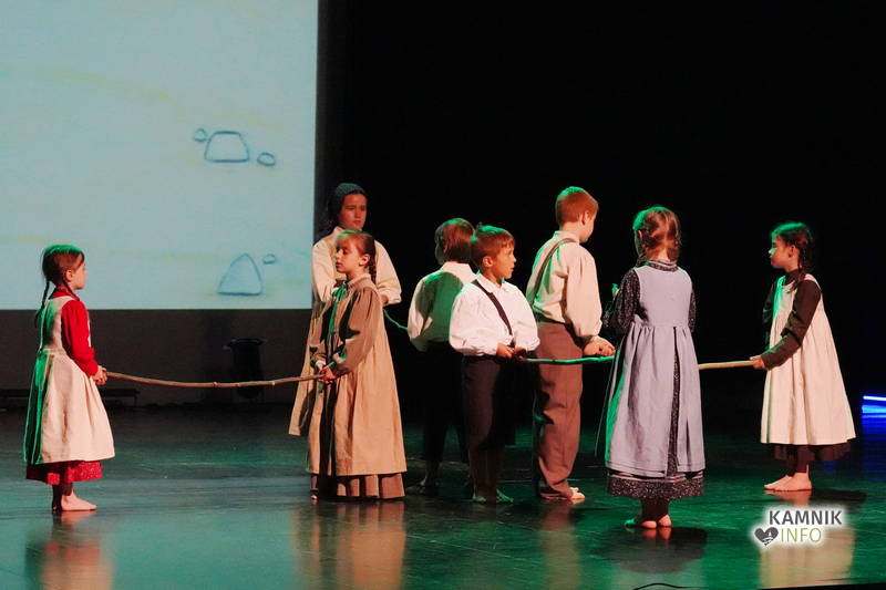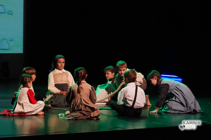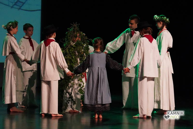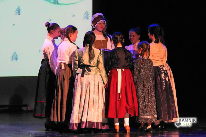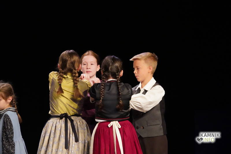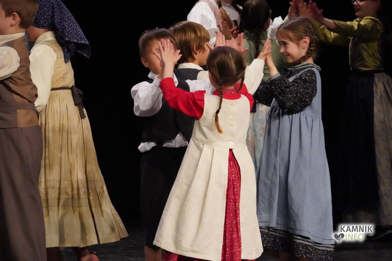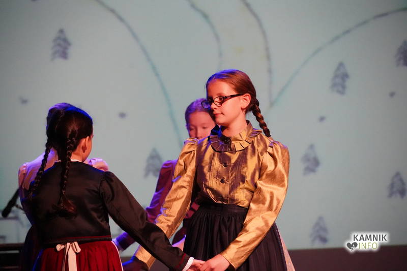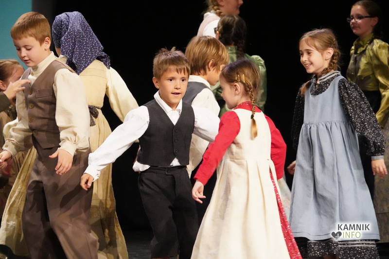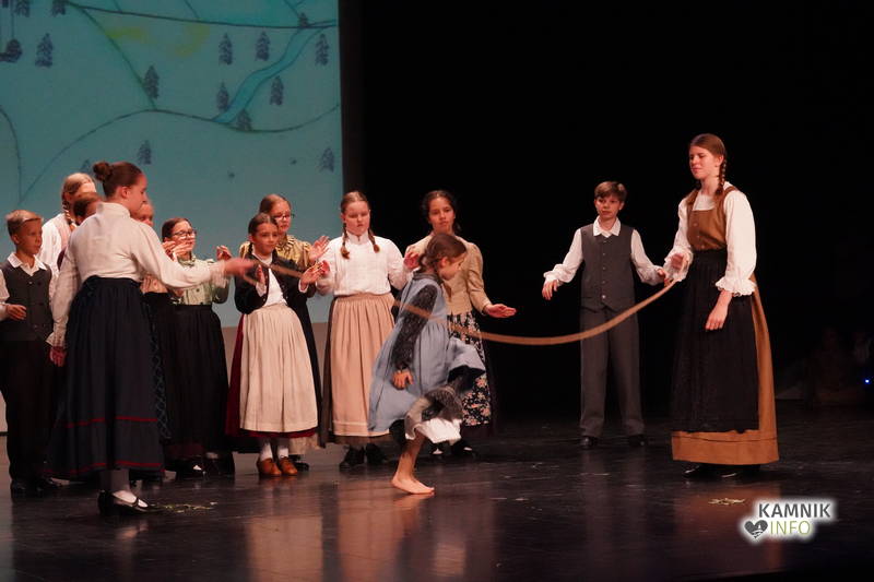 Na odru je nastopilo kar 55 otrok; 21 plesalcev, 9 ljudskih godcev in 25 pevcev. Nekaj članov pevskega zbora in gledališkega kluba je tudi zaplesalo. Vsi so se odlično odrezali, v glavni vlogi pa nas je navdušila drugošolka Manuela Mišković, ki je bila ves čas na odru in plesala skoraj v vseh plesnih postavitvah.