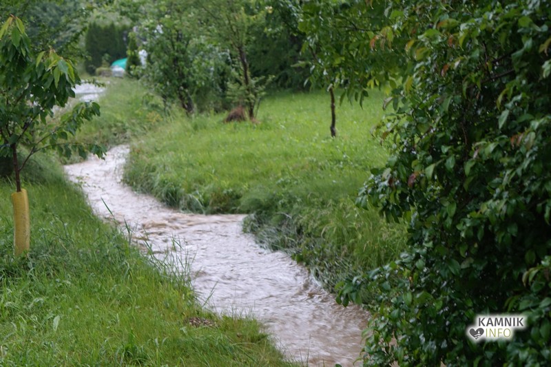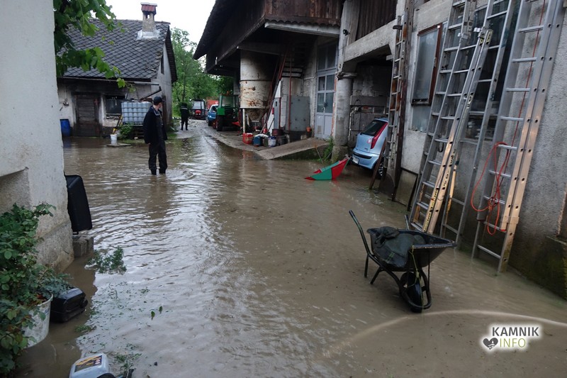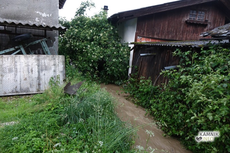 Močna nevihta z obilnimi padavinami, ki se je razbesnela nad okolico Kamnika je, po do zdaj znanih podatkih, največ težav in škode naredila v zaselku Podjelše, kjer meteorna voda zaliva Ožbovčevo domačijo.