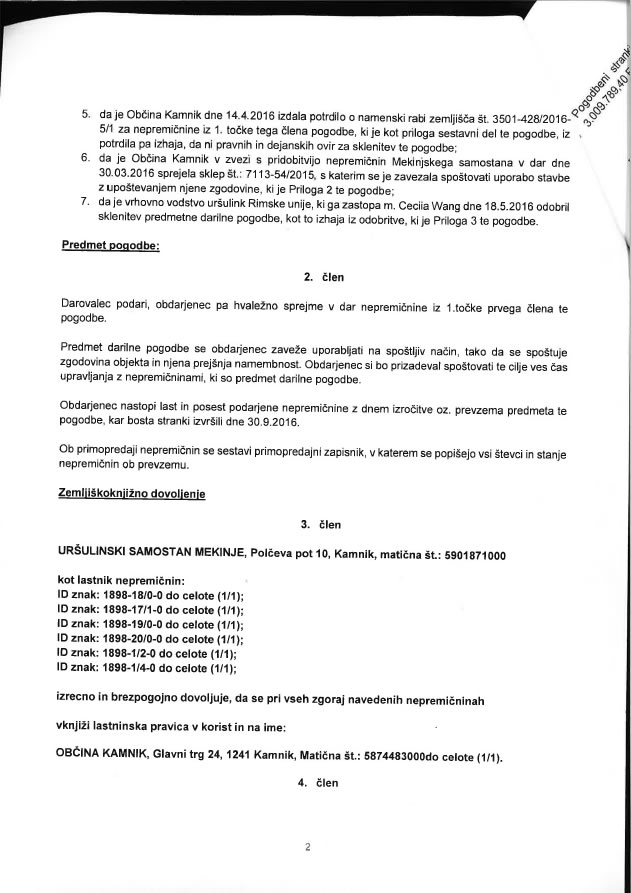 Vrednost nepremičnin, ki so predmet darilne pogodbe med Uršulinskim samostanom Mekinje in Občino Kamnik, naj bi po pogodbi znašala dobre 3 milijone evrov.