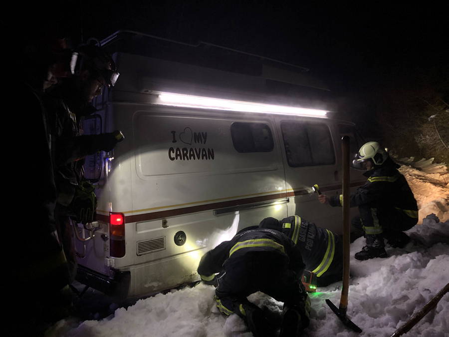 Iz zagate ga rešili gasilci PGD Kamnik, ki so mesto nezgode ustrezno zavarovali, vozilo odkopali in izvlekli iz snega, nato pa na avtodom namestili snežne verige in počitniško vozilo varno pospremili do vrha klanca.