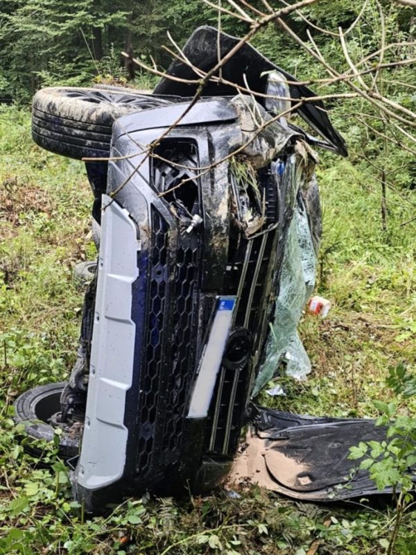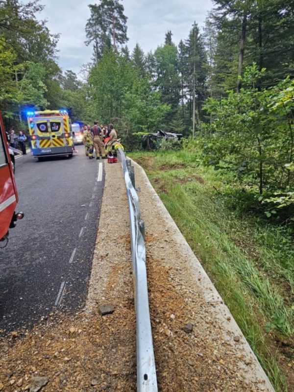 Voznik, ki je v bližini Šinkovega Turna prek odbojne ograje zapeljal s ceste in se prevrnil na bok, je imel kar precej sreče.