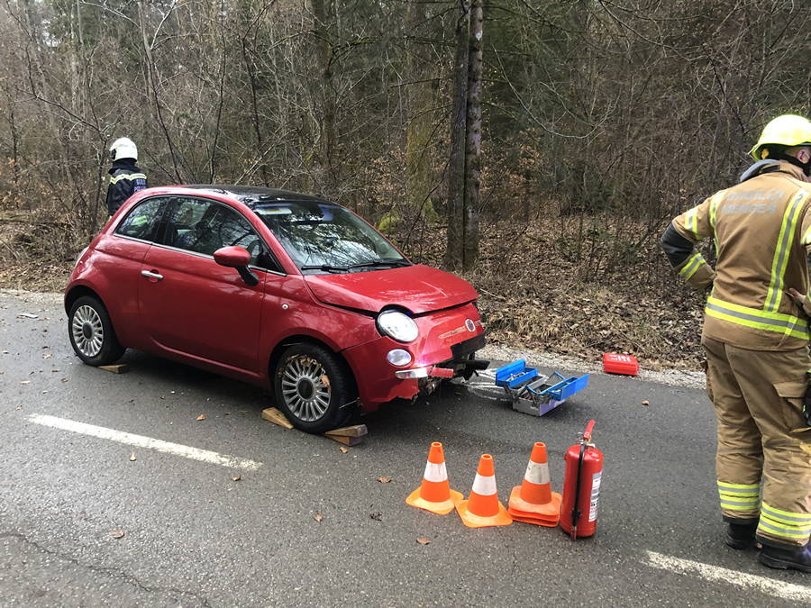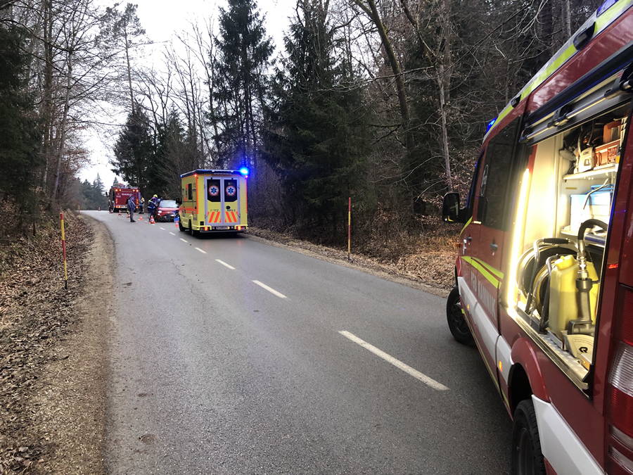 Voznica, ki se je z avtom prevrnila na bok, se je v nesreči lažje poškodovala, vozilo pa so nazaj na kolesa postavili gasilci.