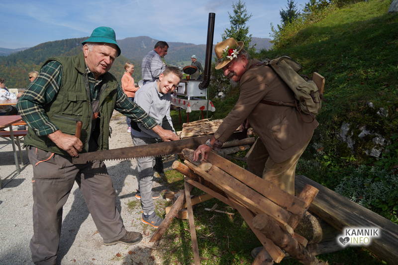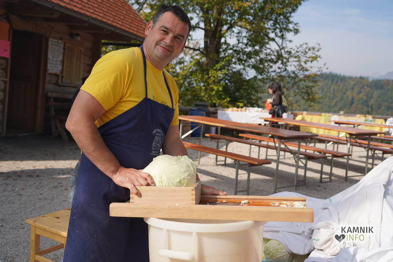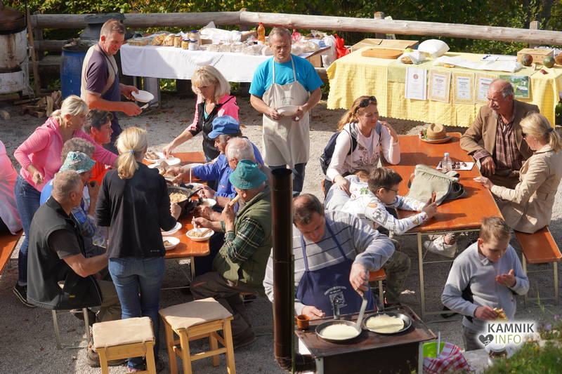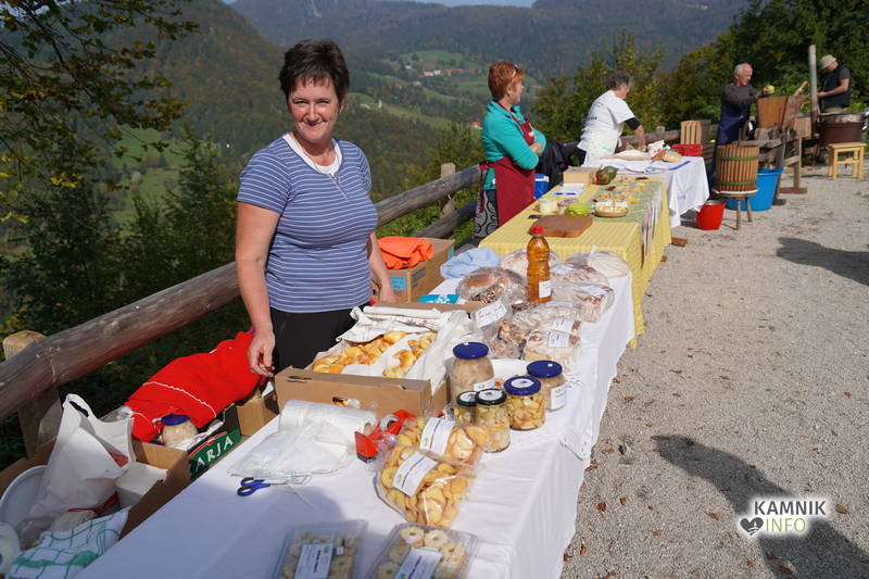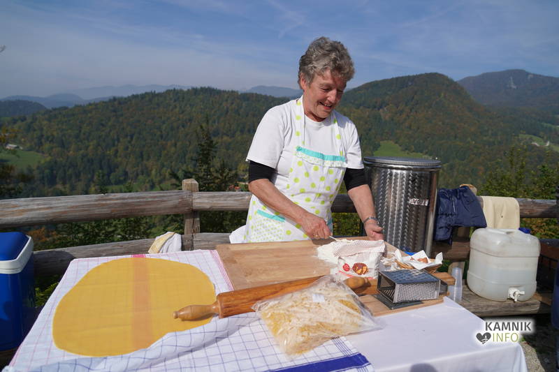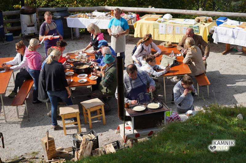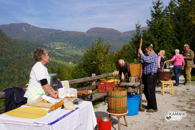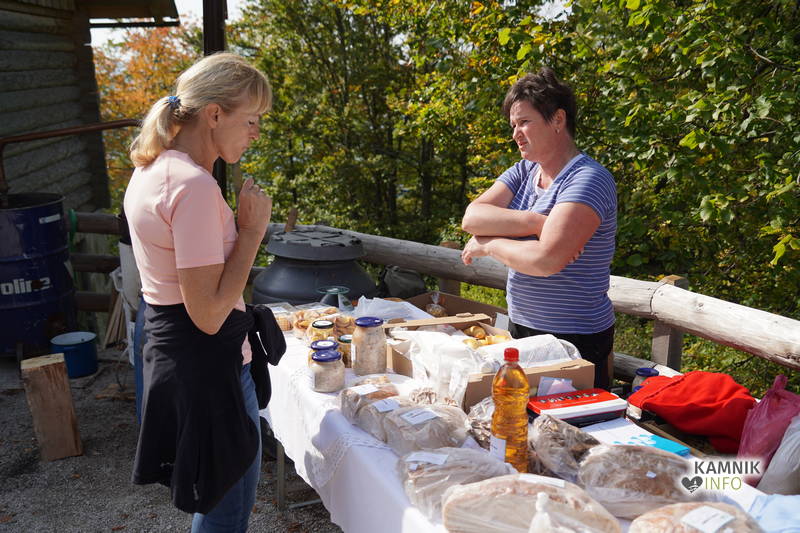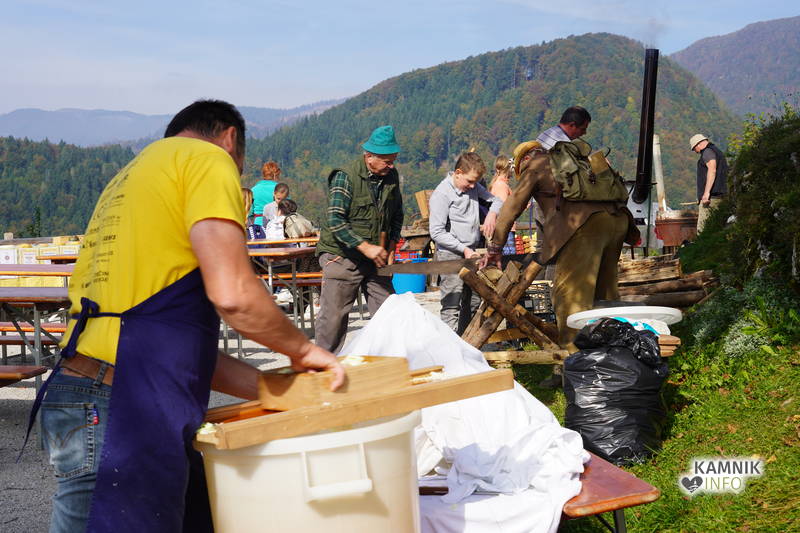 Sem ter tja sta zapeli sekira in žaga, pod prsti pridnih rok je šumelo ličkanje, na dobro nabrušenem ribežnu so se velike glave zelja spreminjale v rezance, skorajda tako tanki in okusni, kot tisti, ki so iz moke in jajc nastajali pod spretnimi prsti gospodinje, sem ter tja se je zaslišalo protestno blejanje ovce z novo frizuro, iz kotla je čisto počasi curljalo in dišalo žganje, marsikatera razstavljena domača dobrota, pa se je iz stojnične mize preselila v torbo in nahrbtnik tega ali onega obiskovalca ter odpotovala v dolino.