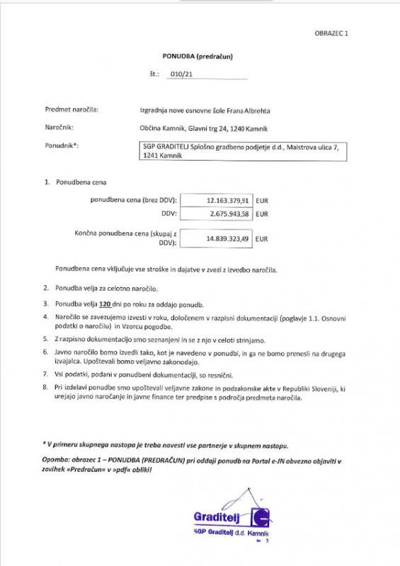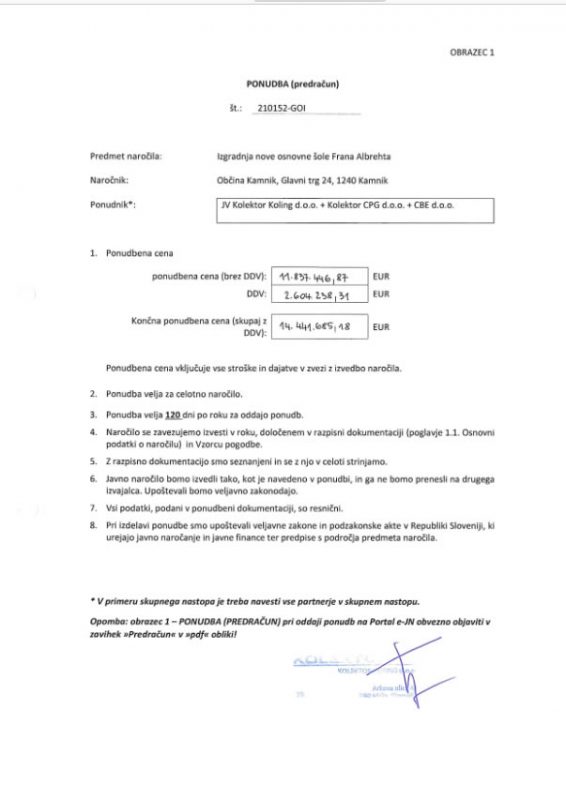 Družba SGP Graditelj bi bila namreč, na podlagi podatkov javnega razpisa Občine Kamnik, novo OŠ Frana Albrehta pripravljena zgraditi za 14.839.323,49 evrov, medtem ko bi družba JV Kolektor Koling d.o.o., skupaj z družbama Kolektor CPG d.o.o in CBE d.o.o., s katerima je oddalo skupno ponudbo, novo šolo zgradila za 14.441.685,18 evrov.
