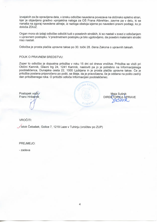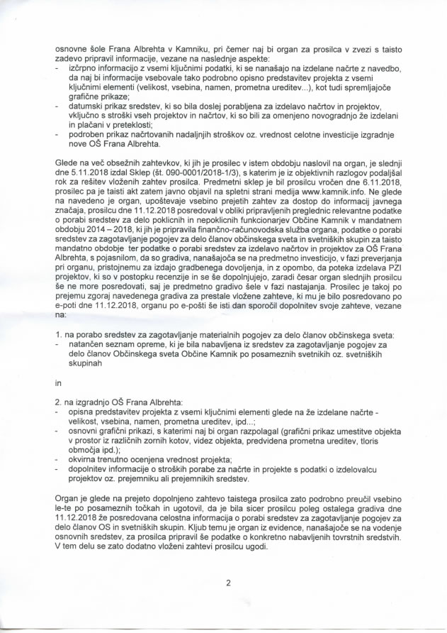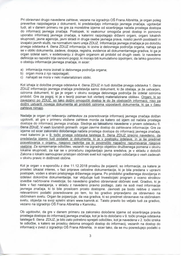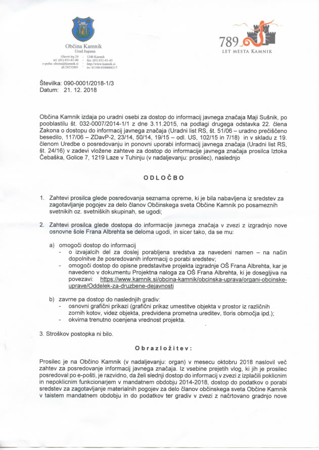 Žal pa vseh zahtevanih informacij še vedno nismo prejeli, saj nam je Občina Kamnik, kot odgovor na našo zahtevo o dopolnitvi posredovanih informacij, poslala zgolj še eno odločbo, izdano 21. 12. 2018, s katero je Občina Kamnik dostop do informacij odobrila zgolj delno, in sicer v delu, ki se nanaša na izvajalce del za doslej porabljena sredstva ter dostop do zelo splošne opisne predstavitve projekta izgradnje OŠ Frana Albrehta, zavrnila pa dostop do osnovnih grafičnih prikazov (grafični prikaz umestitve objekta v prostor iz različnih zornih kotov, videz objekta, predvidena prometna ureditev, tloris območja ipd.) ter okvirno trenutno ocenjeno vrednost projekta, četudi gre za informacije s katerimi Občina Kamnik nedvomno (že) razpolaga.