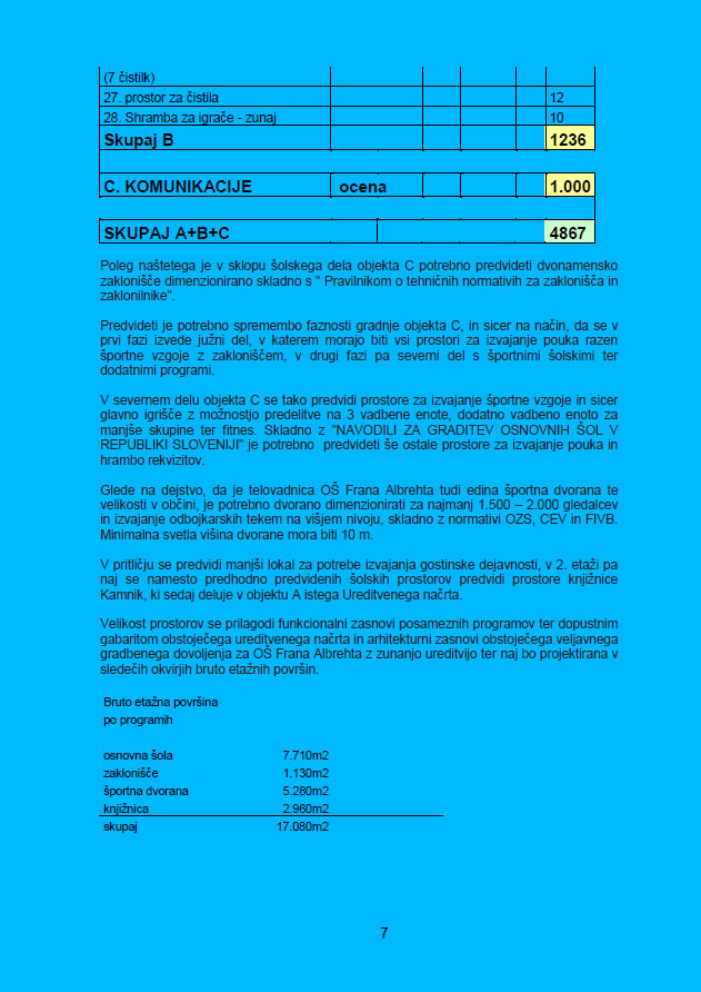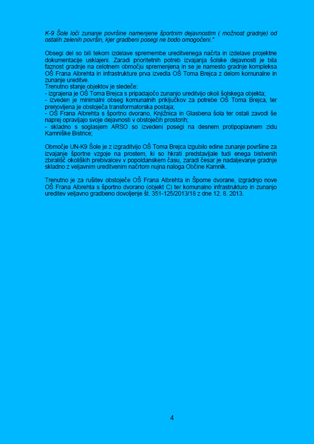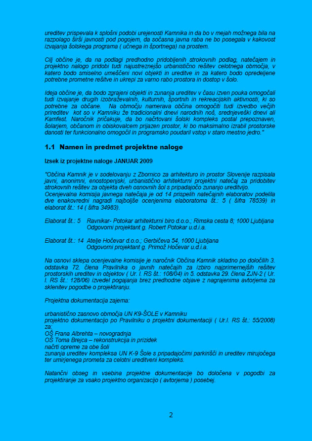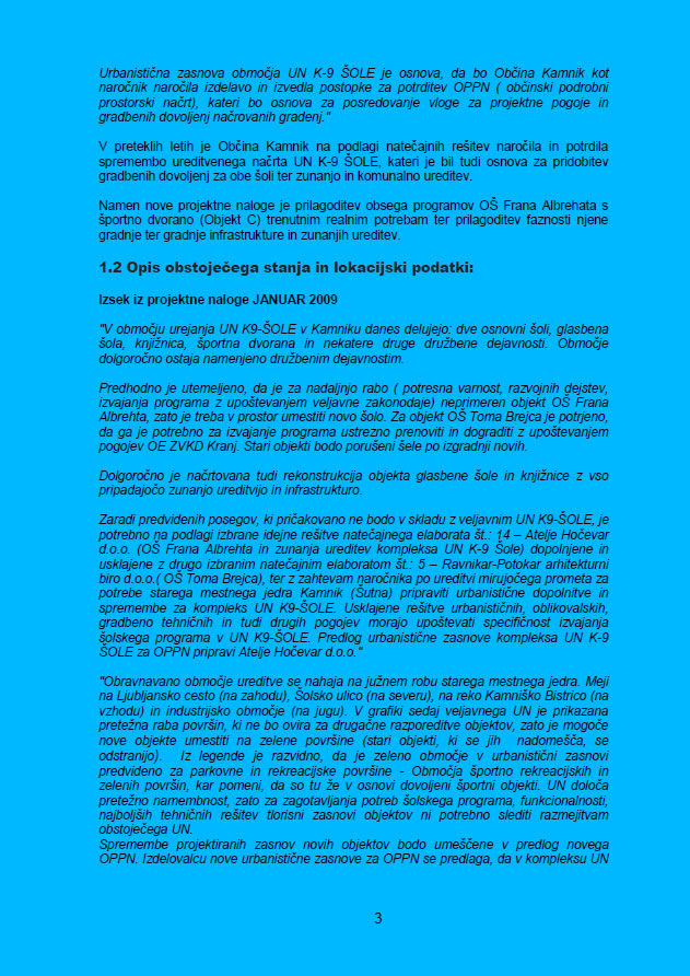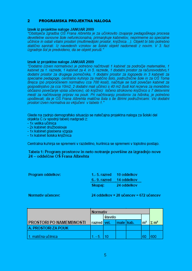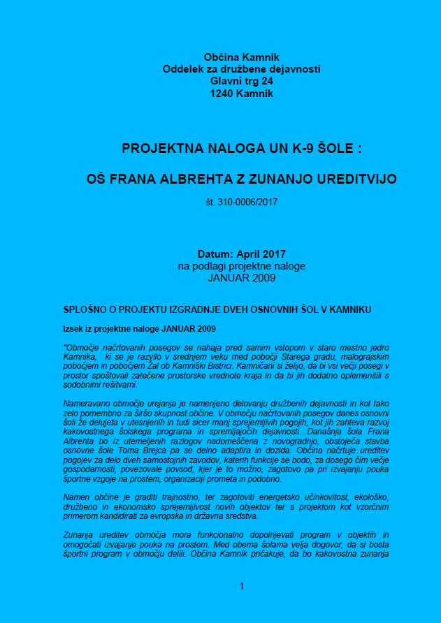 Občina Kamnik je obenem posredovala tudi dostop do opisne predstavitve projekta izgradnje OŠ Frana Albrehta, in sicer na način, da je na svojo spletno stran dodala povezavo do dokumenta: PROJEKTNA NALOGA UN K-9 ŠOLE: OŠ FRANA ALBREHTA Z ZUNANJO UREDITVIJO (klik za prenos dokumenta), ki pa bržkone zgolj izvleček oz. del celotnega dokumenta, saj je brez slikovnih in drugih predlog, v obliki, kot je objavljen, pa ne pove prav dosti, ampak v večji meri prinaša zgolj izseke projektne naloge iz leta 2019 ter našteva gole podatke o vrsti in velikosti predvidenih prostorov.