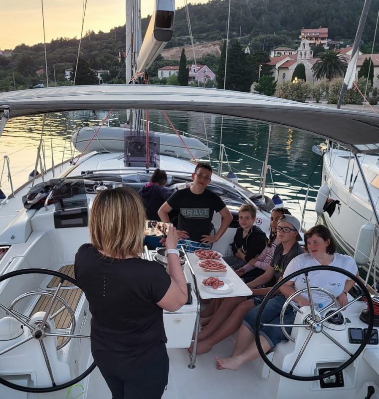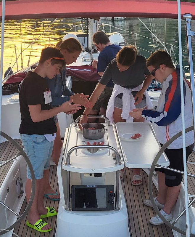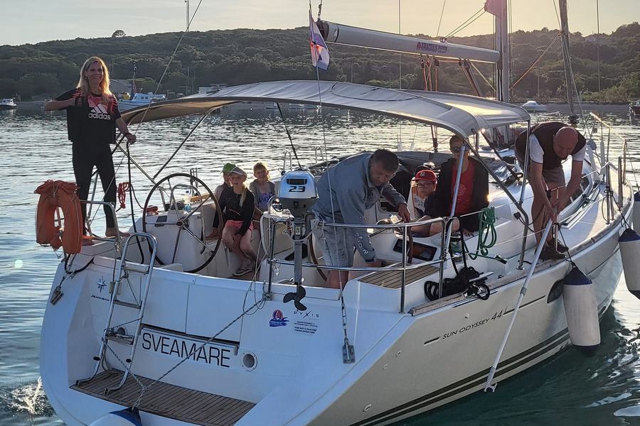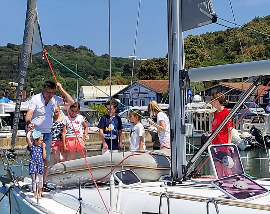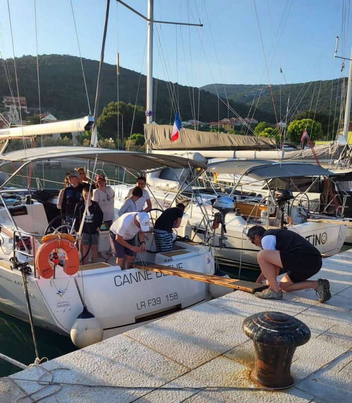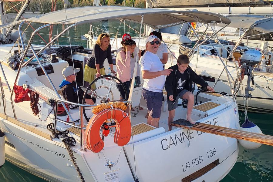 Dan se je začel s čudovitim vremenom. V marini so se zbrani vsi udeleženci prvega dela. Prihodu udeležencev je sledilo vkrcanje, namestitev po kabinah, seznanitev udeležencev z jadrnico in varnostjo med plovbo.