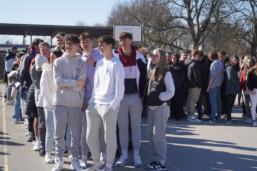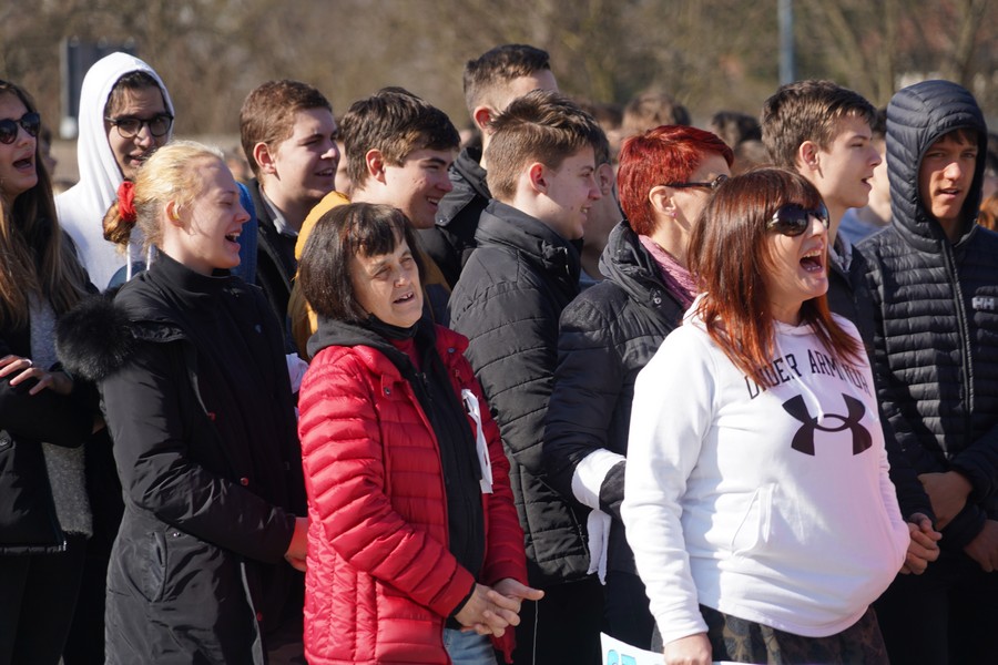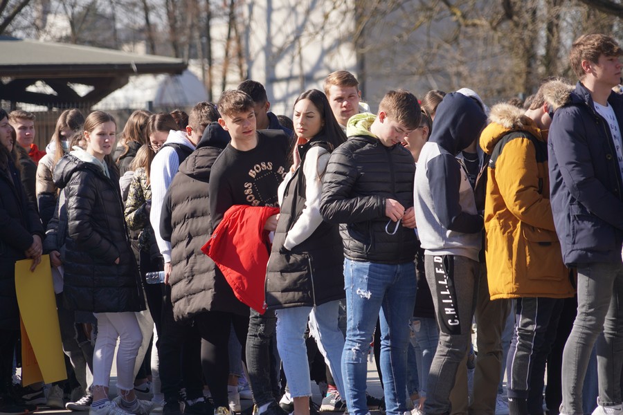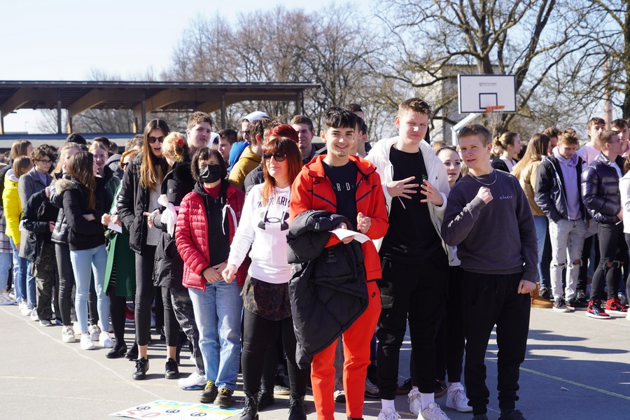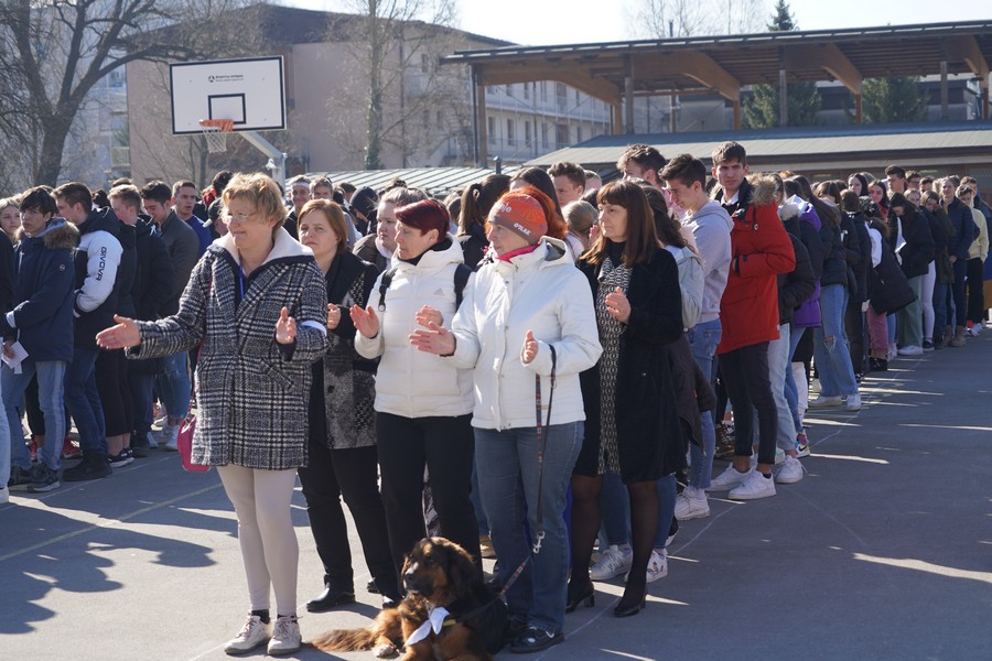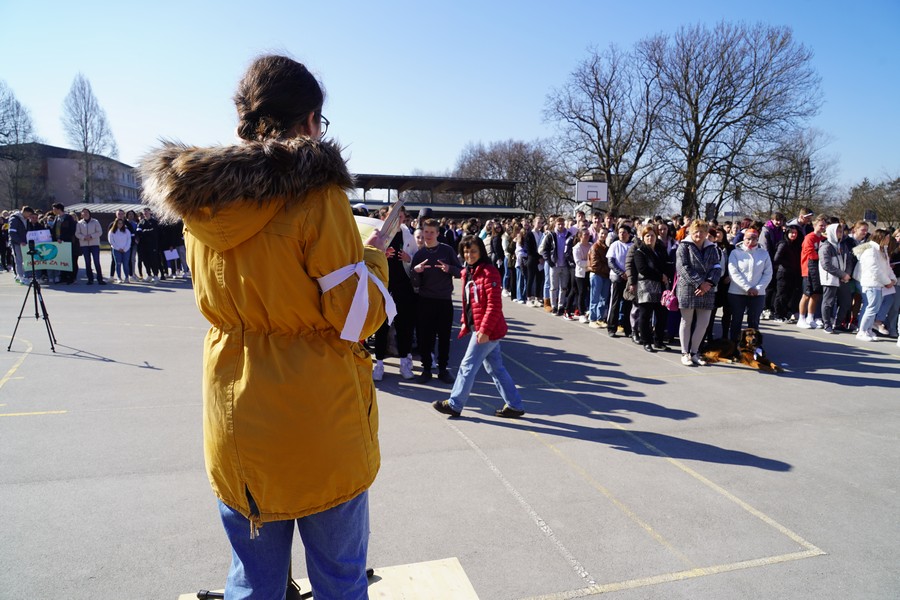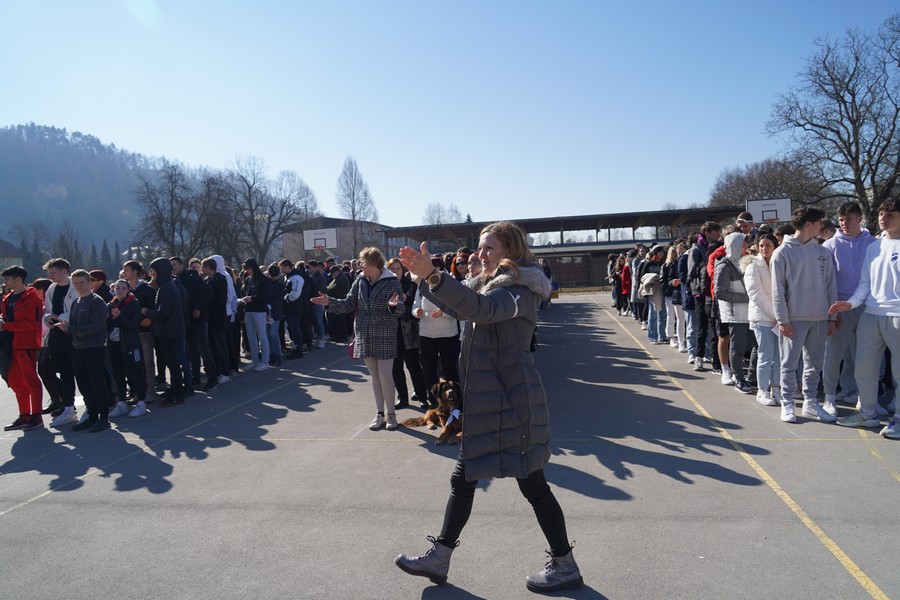 Opremljeni z nekaj transparenti in belimi pentljami so, kot simbolični golobi miru, na šolskem igrišču s svojimi telesi izoblikovali napis MIR, le-tega z glasnimi vzkliki tudi zahtevali ter prisluhnili krajšemu, miroljubnemu kulturnemu programu, ki so ga dijaki in profesorji pripravili v ta namen.