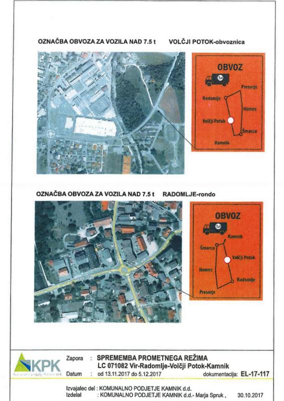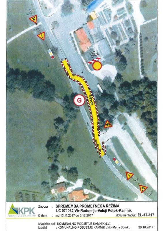 Občina Kamnik in Komunalno podjetje Kamnik d.d., kot izvajalec del, občanke in občane seznanjajo s spremembo začasnega prometnega režima – popolno zaporo ter prekopom na lokalni cesti Vir – Radomlje – Volčji Potok – Kamnik v naselju Volčji Potok pri Arboretumu zaradi »rekonstrukcije propusta na lokalni cesti« v času od ponedeljka, 13. novembra 2017, do torka 5. decembra 2017.