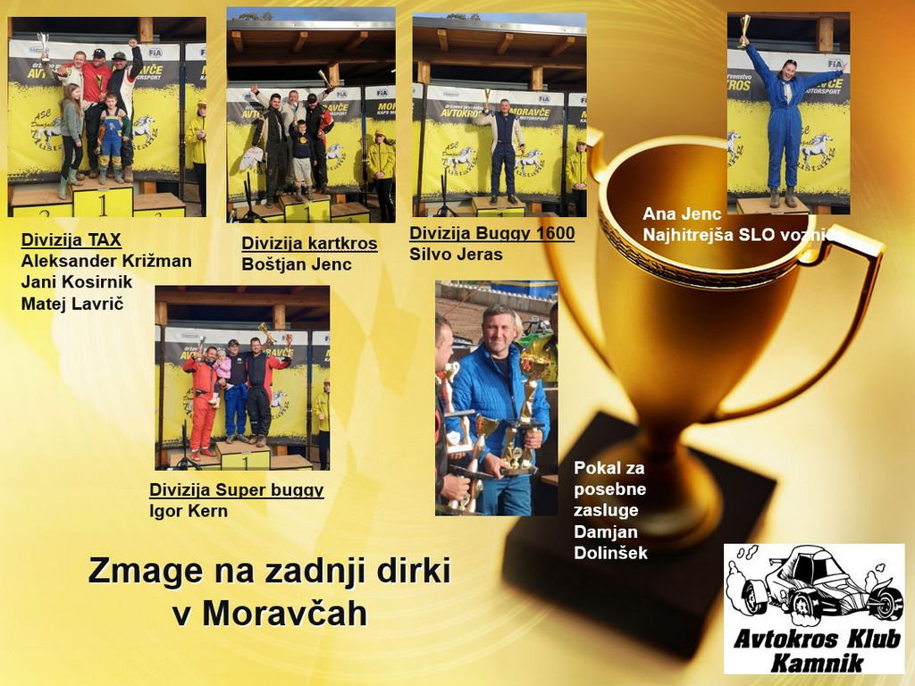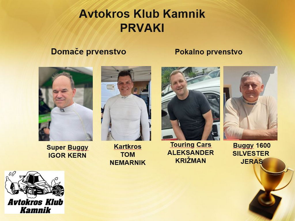 Že pred to zadnjo dirko je bilo jasno, kdo so letošnji prvaki: Igor Kern v diviziji Super Buggy, Tom Nemarnik v diviziji kartkros, Aleksander Križman, pokalni prvak v diviziji Touring Car, in Silvester Jeras, prvak v diviziji Buggy 1600. Vsi omenjeni vozniki so vozniki Avtokros kluba Kamnika.